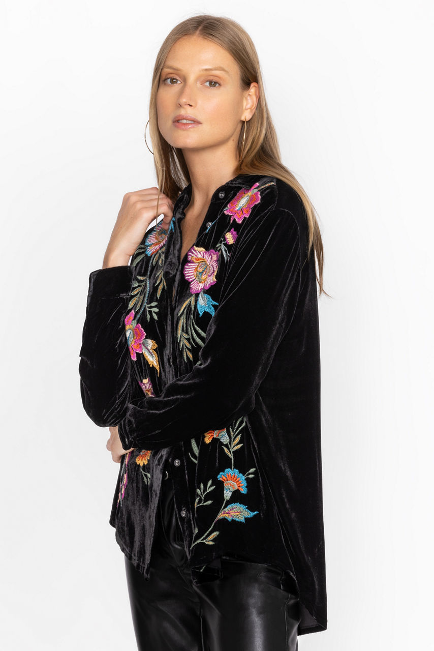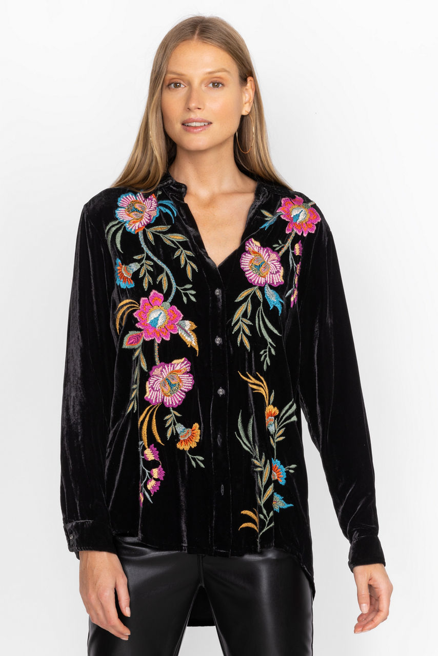 Featuring a bold backdrop expertly decorated with vivid floral bouquets, the Sidonia Velvet Oversized Pleat Shirt offers a relaxed fit for casual weekend get-togethers. Crafted from a luxurious silk blend and adorned with colorful placement embroidery, this lovely blouse features chic fabric covered buttons. Pair with comfortable black leggings and smart flats to complete the look.
