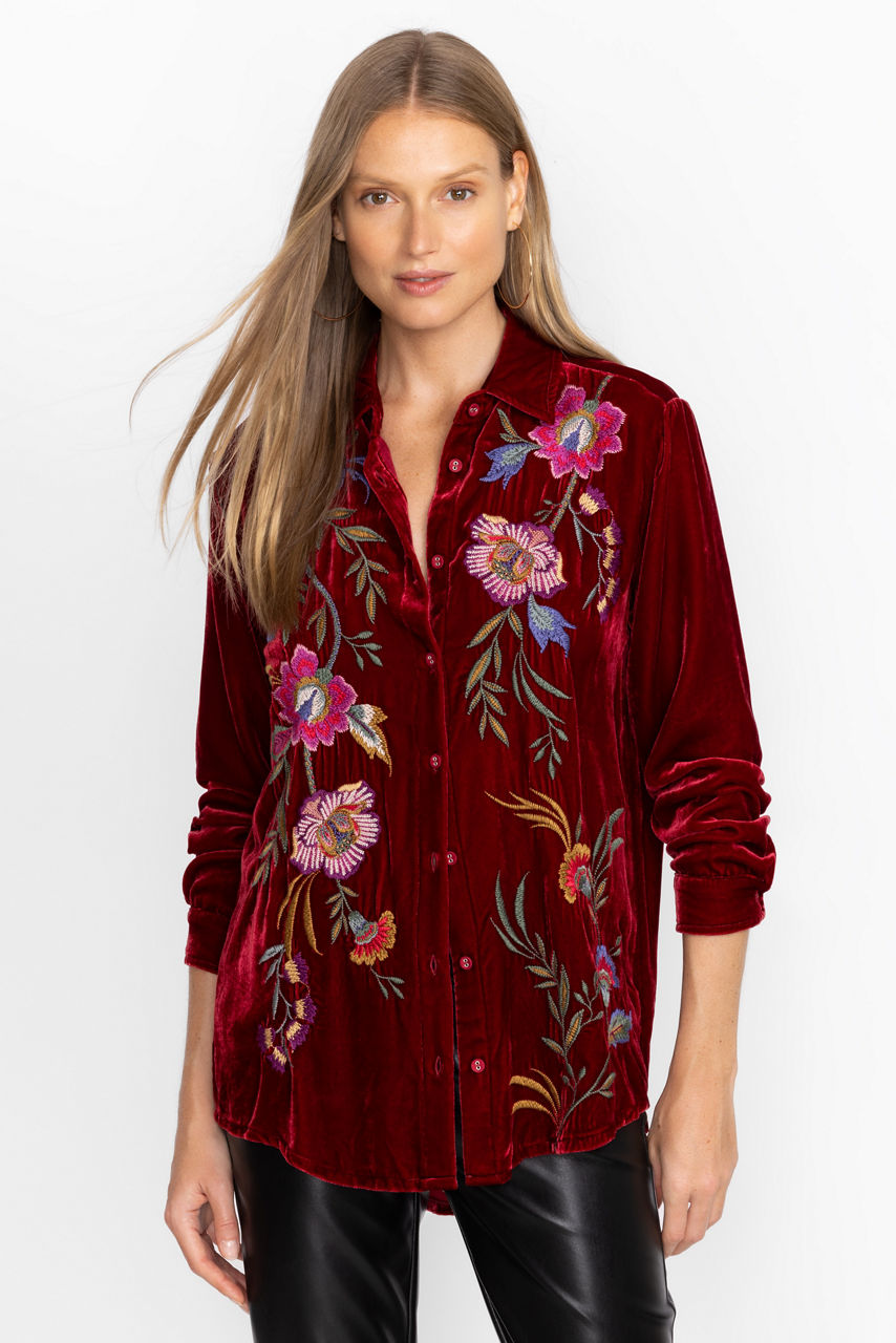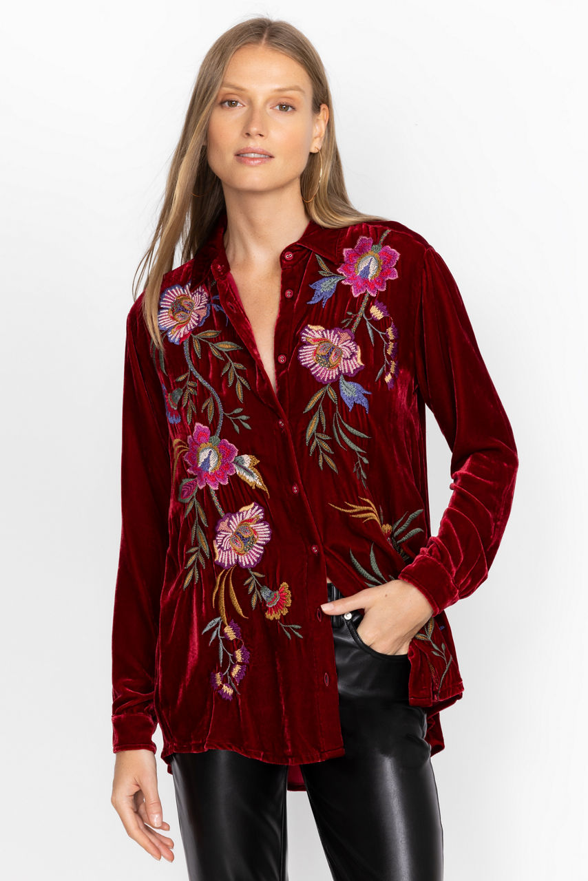 Featuring a bold backdrop expertly decorated with vivid floral bouquets, the Sidonia Velvet Oversized Pleat Shirt offers a relaxed fit for casual weekend get-togethers. Crafted from a luxurious silk blend and adorned with colorful placement embroidery, this lovely blouse features chic fabric covered buttons. Pair with comfortable black leggings and smart flats to complete the look.