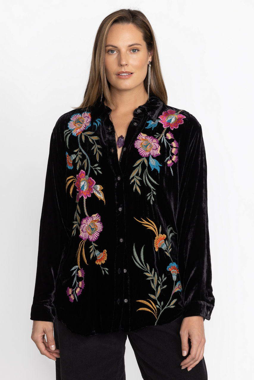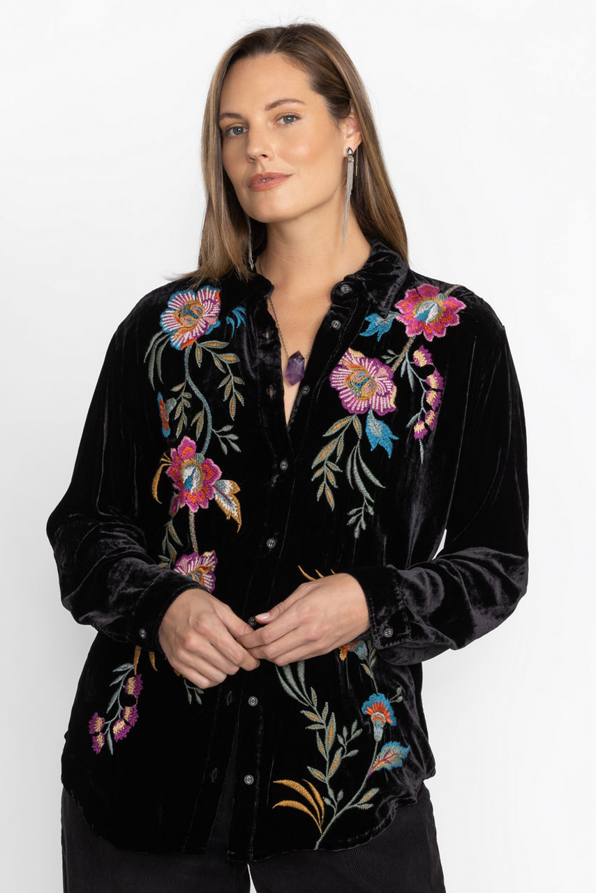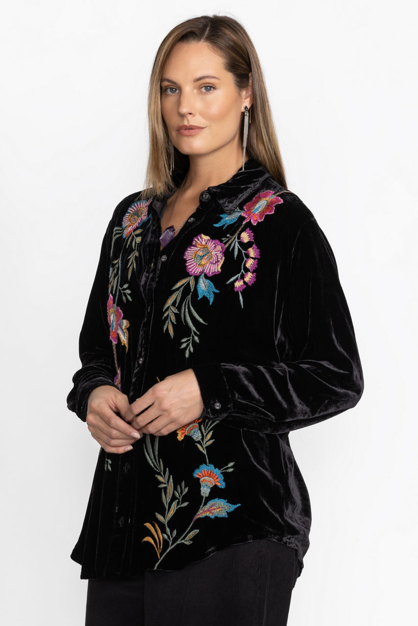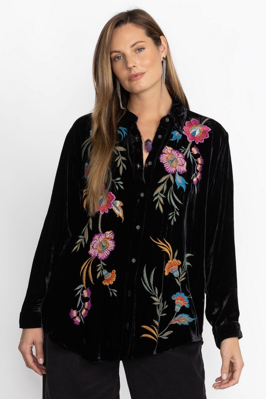 Featuring a bold backdrop expertly decorated with vivid floral bouquets, the Sidonia Velvet Oversized Pleat Shirt offers a relaxed fit for casual weekend get-togethers. Crafted from a luxurious silk blend and adorned with colorful placement embroidery, this lovely blouse features chic fabric covered buttons. Pair with comfortable black leggings and smart flats to complete the look.