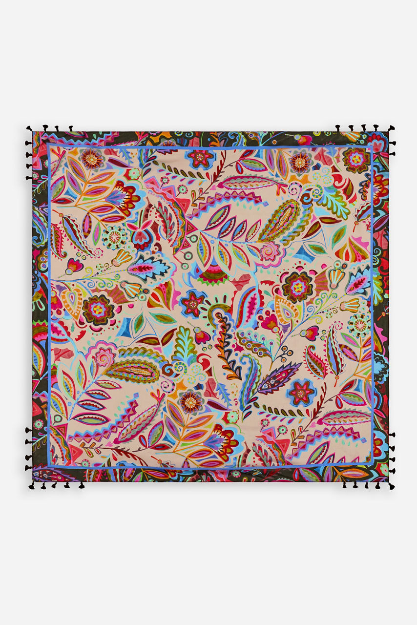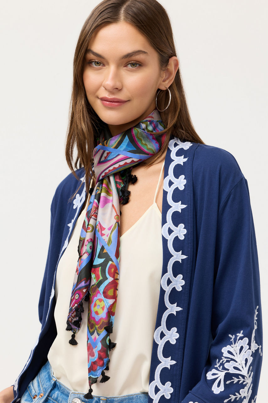 Crafted from luxurious 100% silk, the Silvana Silk Scarf is a rich colorful accessory. Featuring a beautiful blend of vibrant floral and paisley, this unique scarf is bordered with bold color enhanced with eye-catching lines of pattern. Wear over your hair on windy days to maintain a perfect coiffed style.
