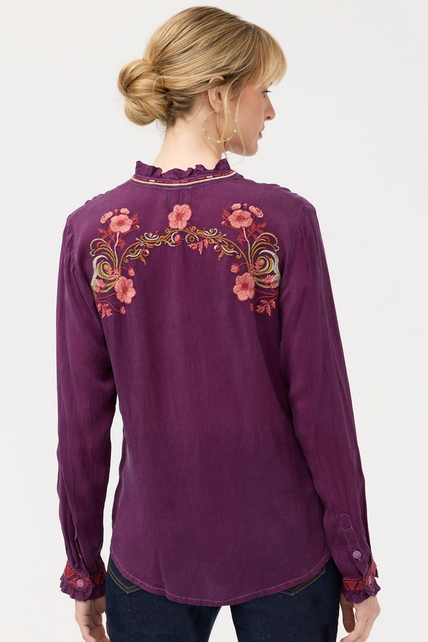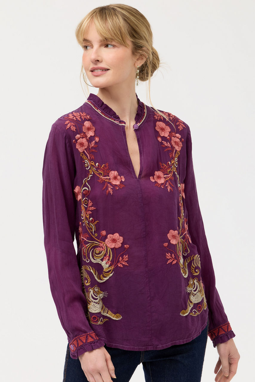 Crafted from a lightweight, flowing fabric, the Roma Simone Blouse is embellished with intricate embroidered details depicting vibrant floral and fauna. Designed with a keyhole front with ruffles at the collar and cuffs, this blouse features Bishop sleeves and side slits for a relaxed fit. Pair with jeans and coordinating flats for a polished casual look.