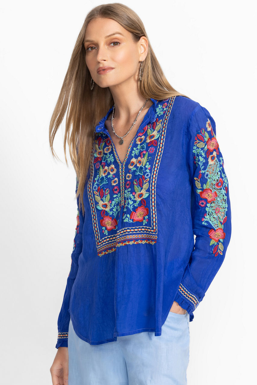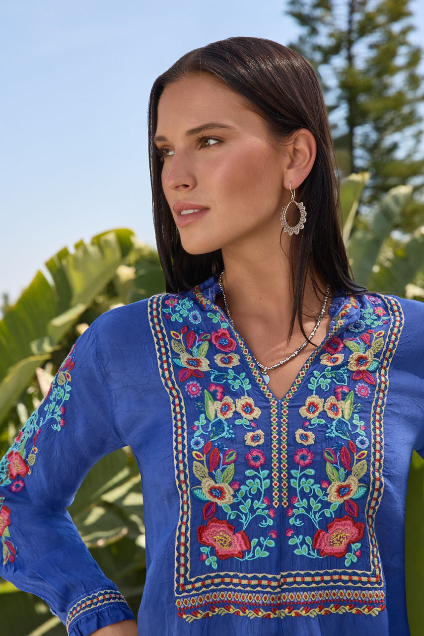 Crafted from a lightweight flowing fabric, the Simone Blouse is adorned with vibrant color and intricate embroidered detailing. Designed with a ruffled collar and a keyhole slit at the front, this blouse is finished with a decorative placket and gently puffed bishop sleeves. Pair with linen pants and casual sandals for a relaxing resort getaway.