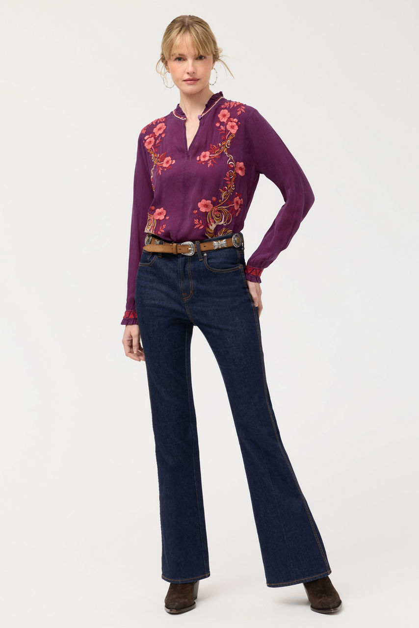 Crafted from a lightweight, flowing fabric, the Roma Simone Blouse is embellished with intricate embroidered details depicting vibrant floral and fauna. Designed with a keyhole front with ruffles at the collar and cuffs, this blouse features Bishop sleeves and side slits for a relaxed fit. Pair with jeans and coordinating flats for a polished casual look.