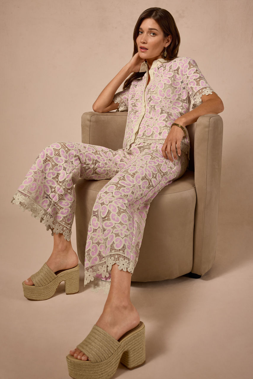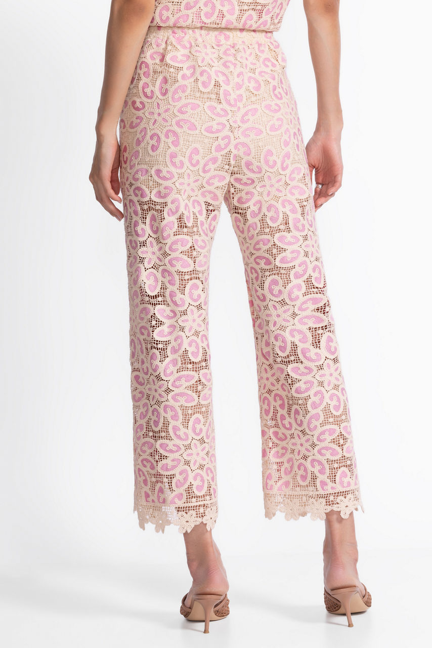 The Simone Cropped Pants are crafted from a rich cotton blend in light and airy pastel hues. Designed with a comfortable elastic waist, these partially lined pants are intricately crocheted and finished with a stunning lace trim. Pair with a silk cami and strappy sandals for a polished resort-inspired look.