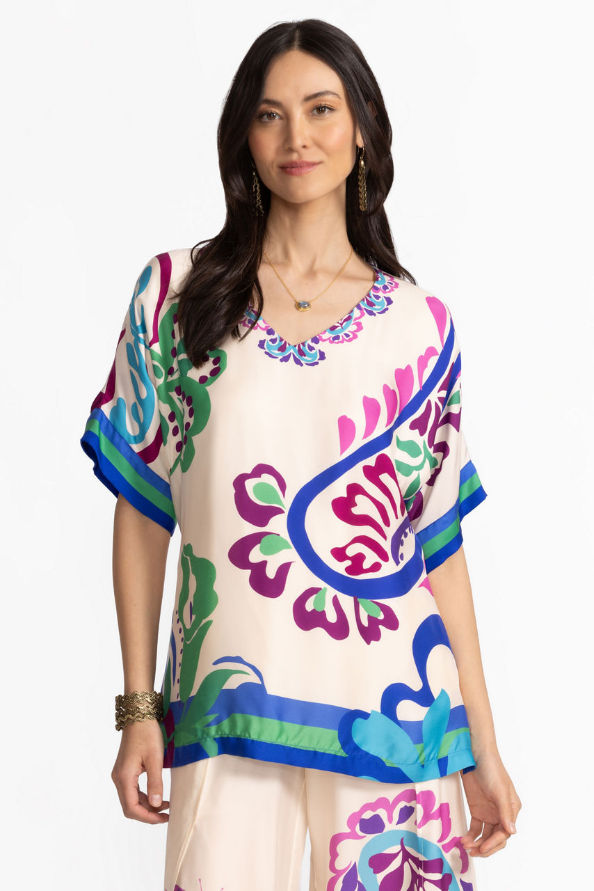Boldly embellished with a vibrant floral pattern, the Slater Tunic is crafted from a unique silk blend. Designed with a V-neckline and short sleeves, this tunic is finished with side slits for a relaxed fit. Pair with coordinating leggings and flats for a comfortable casual ensemble with elevated style.