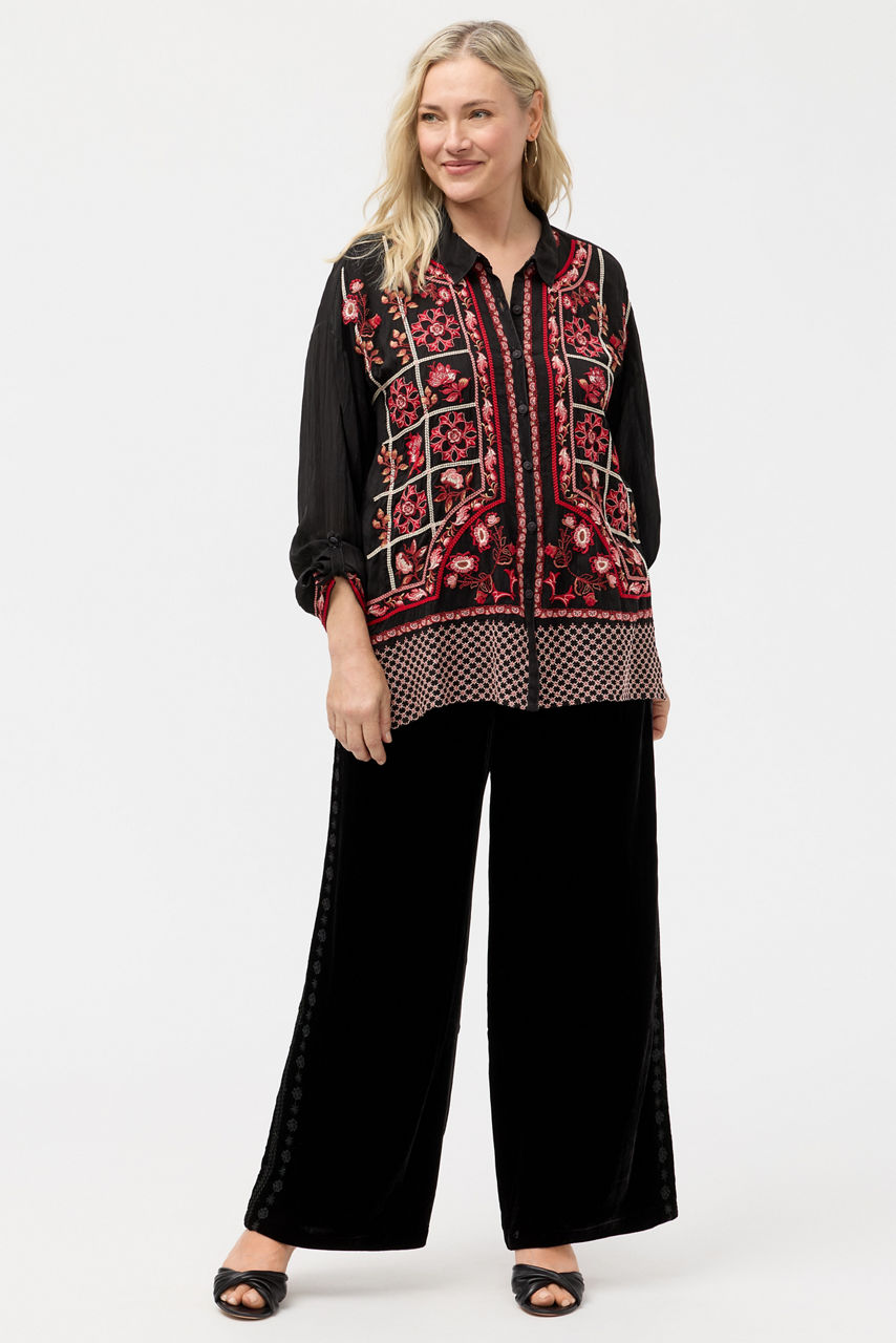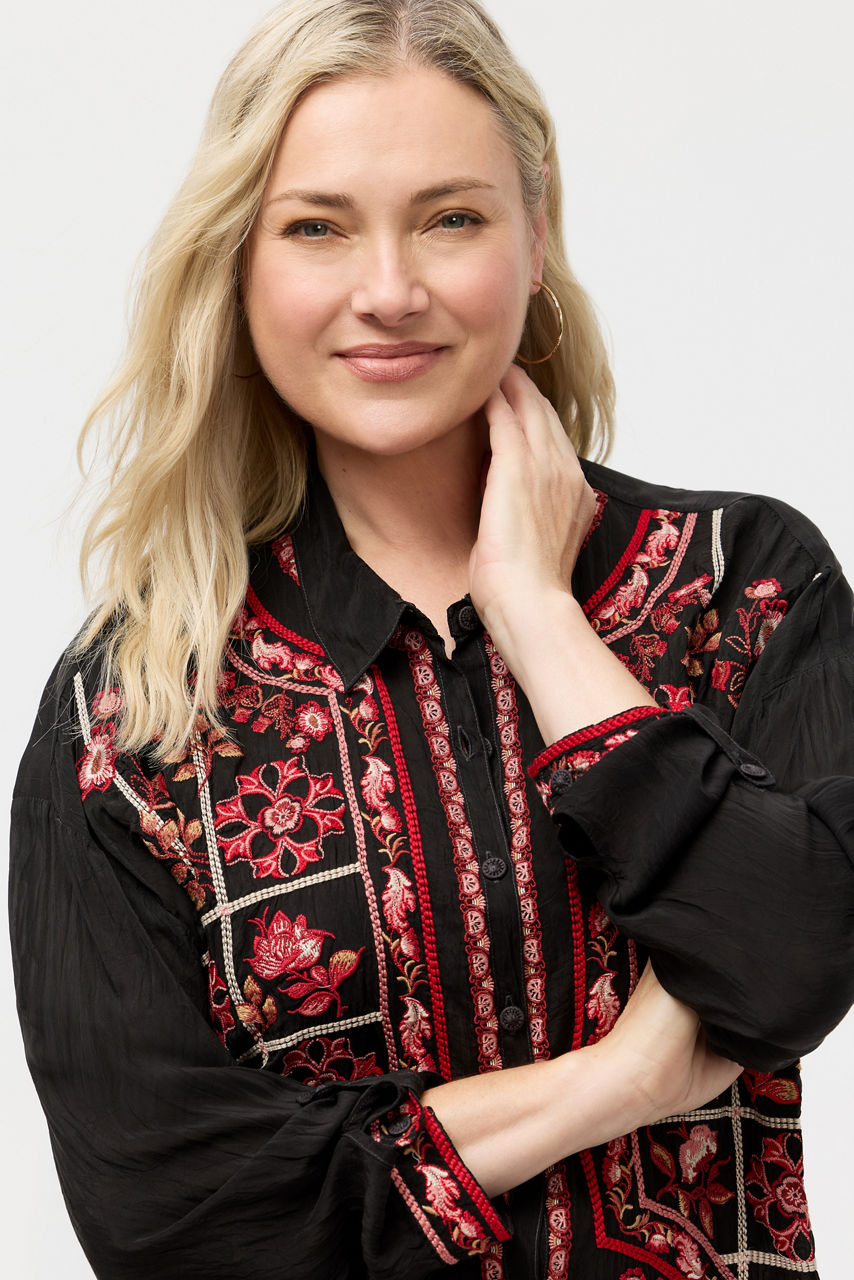 Crafted from a lightweight flowing fabric, the Alejo Blouse is embellished with intricate embroidery. Designed with a button-front and drop shoulders, this vibrant top is accented with brilliant color and is finished with roll-tab sleeves and side slits for a relaxed fit. Pair with dark-wash denim and modern flats for a polished casual look.