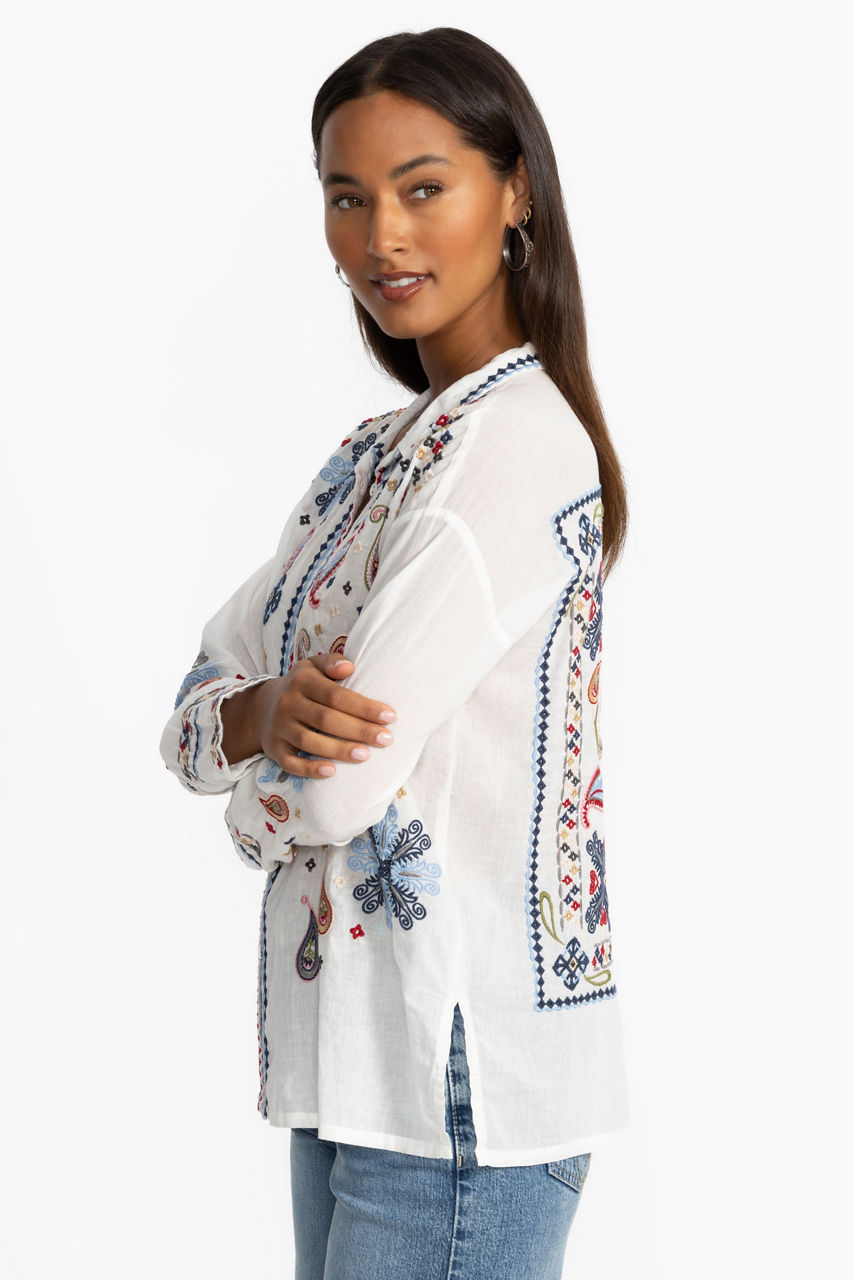 Offering a stunning alternative to a classic button-down, the Slim Audrey Embroidered is beautifully adorned with colorful accents on a crisp backdrop. Crafted from 100% breathable cotton, this collared button-front is finished with a drop sleeve and contrasting embroidered details along the button placket and hemline. Pair with trousers and modern loafers for an easy office ensemble.