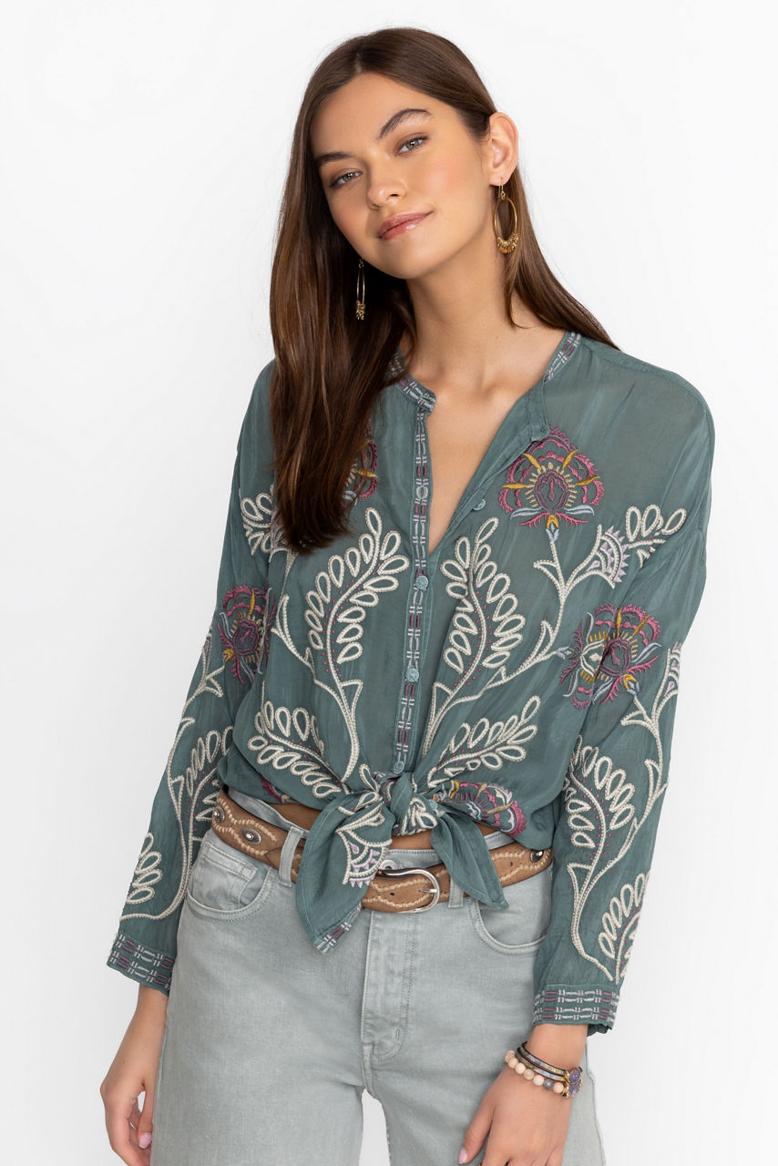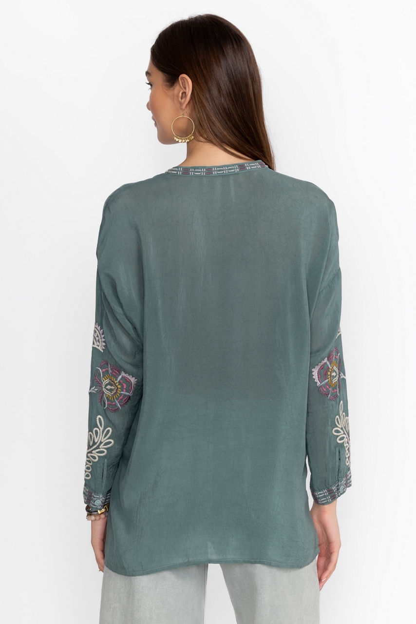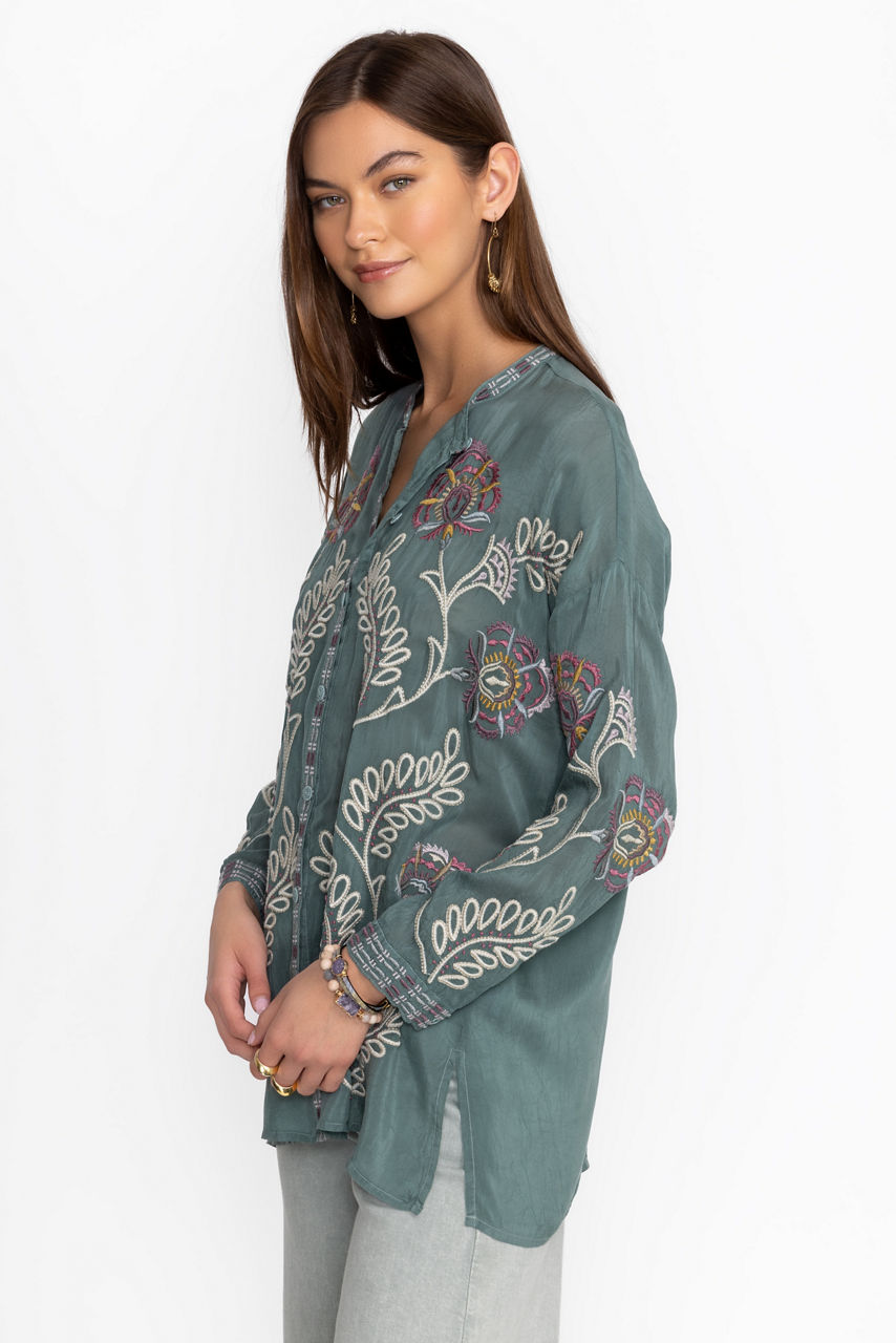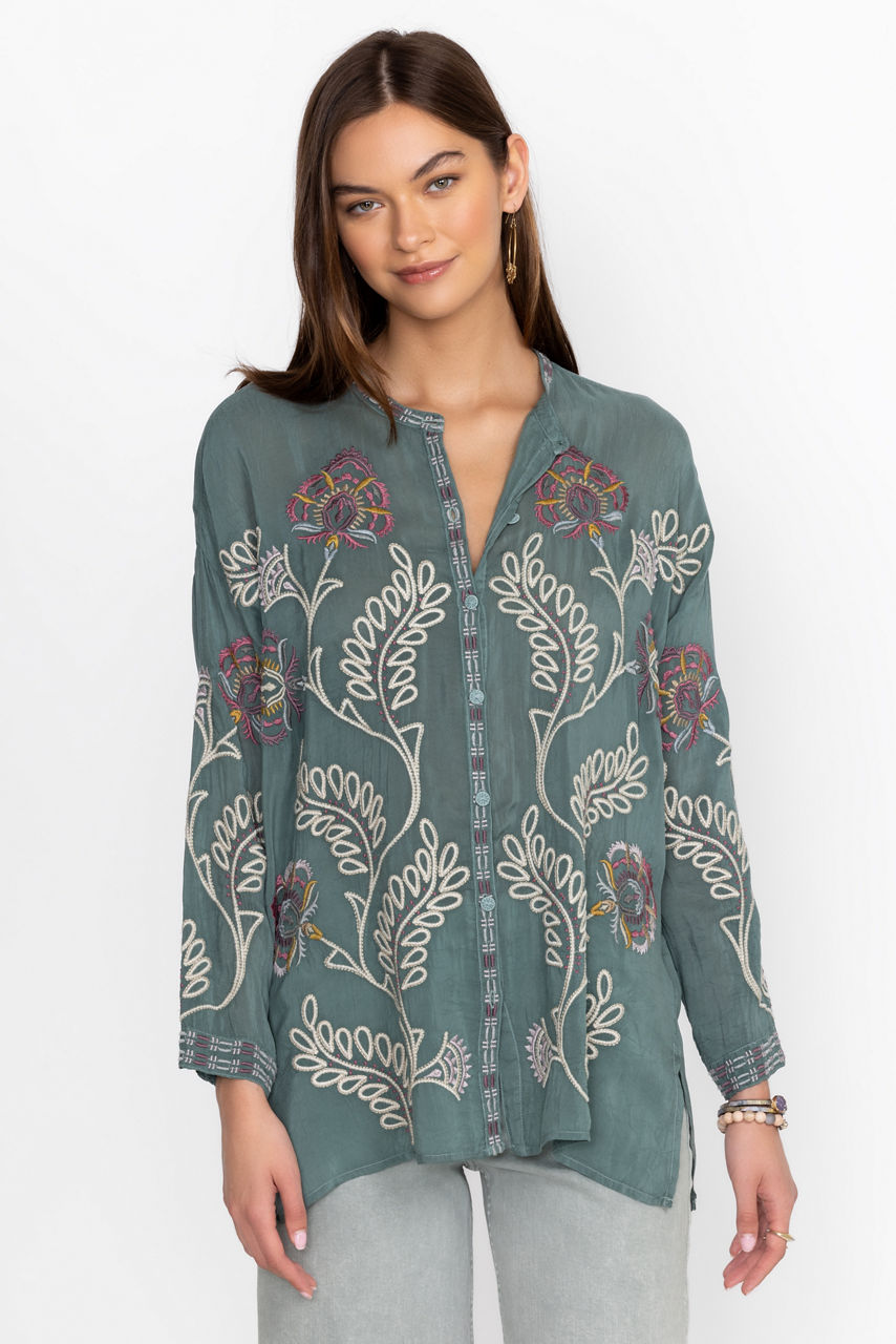 Crafted from a lightweight flowing fabric, the Martina Slim Audrey Tunic is enhanced with intricate floral placement embroidery. Featuring a rounded collar and relaxed drop sleeves, this vibrant and bold blouse is finished with a contrasting button placket. Pair with fitted leggings and smart flats for an elevated weekend look.