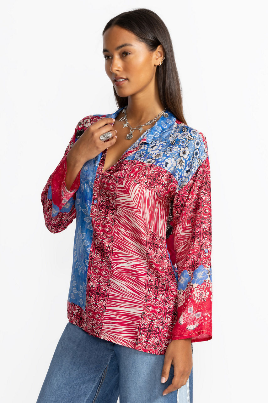 Crafted from 100% luxurious silk, this stunning tunic is adorned with a bold graphic print in rich colors. Featuring a Henley neckline and long sleeves with a roll-tab option, this ornate tunic is finished with side slits for a relaxed fit. Pair with fitted leggings and classic flats for a polished look perfect for a casual dinner out.