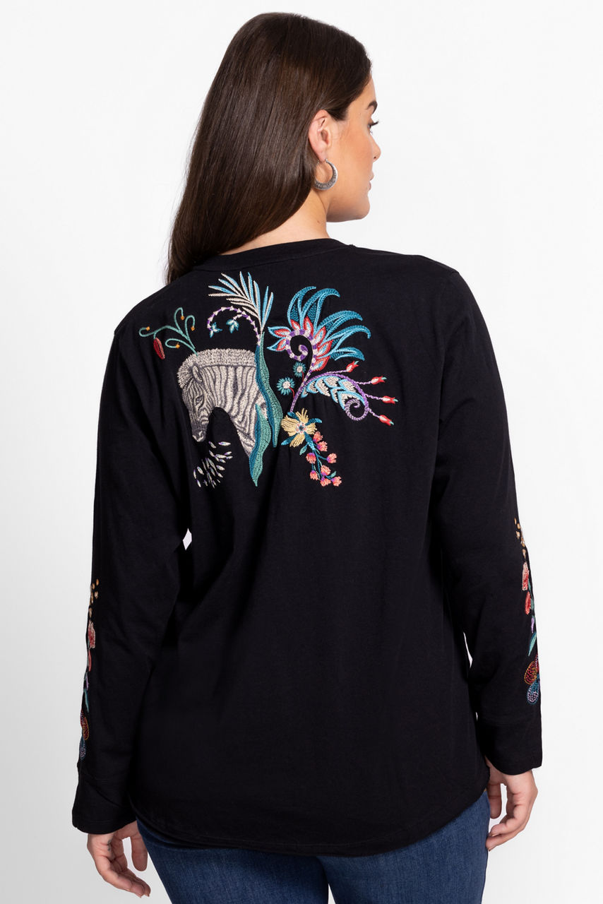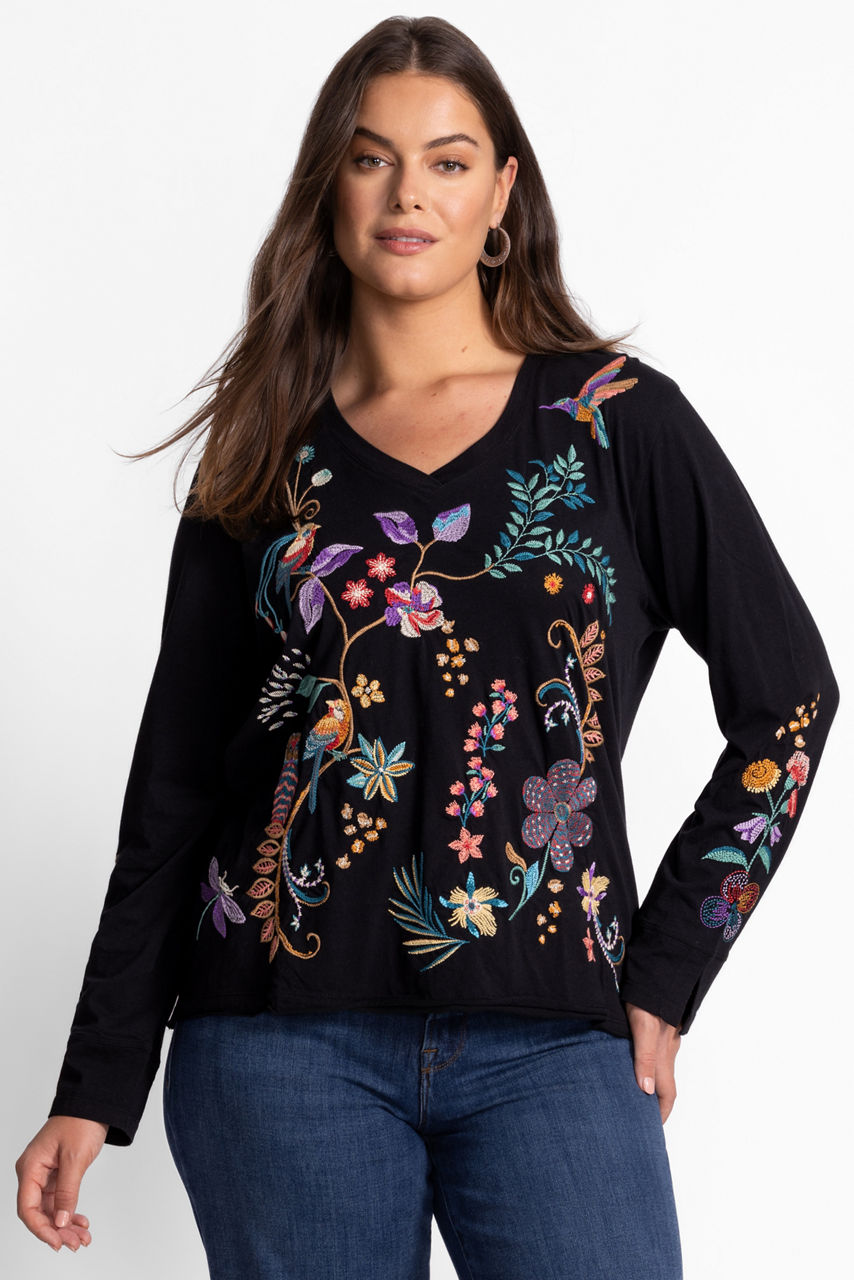 Crafted from breathable 100% cotton, the Belina Slit Sleeve Tee offers a fresh take on a classic wardrobe staple. Featuring a V-neckline and split cuffs for a tailored look, this lightweight tee is finished with bold embroidered detailing in vibrant colors. Pair with linen shorts and casual sandals for an elevated weekend combination.