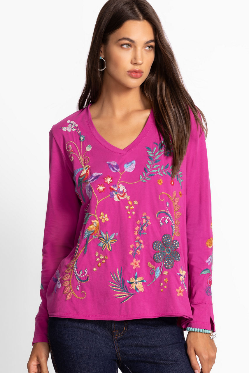 Crafted from breathable 100% cotton, the Belina Slit Sleeve Tee offers a fresh take on a classic wardrobe staple. Featuring a V-neckline and split cuffs for a tailored look, this lightweight tee is finished with bold embroidered detailing in vibrant colors. Pair with linen shorts and casual sandals for an elevated weekend combination.