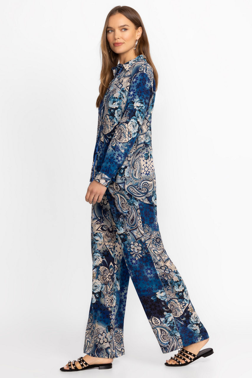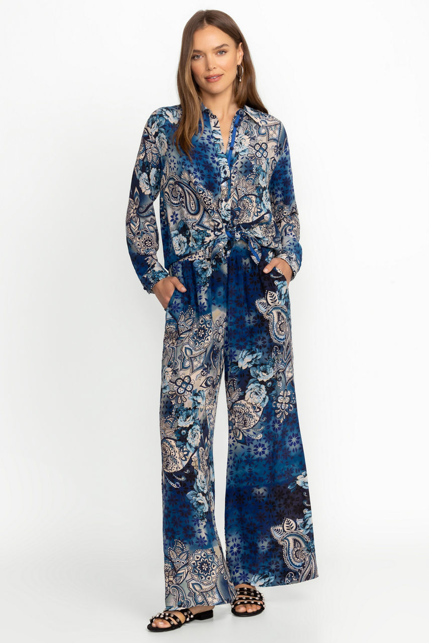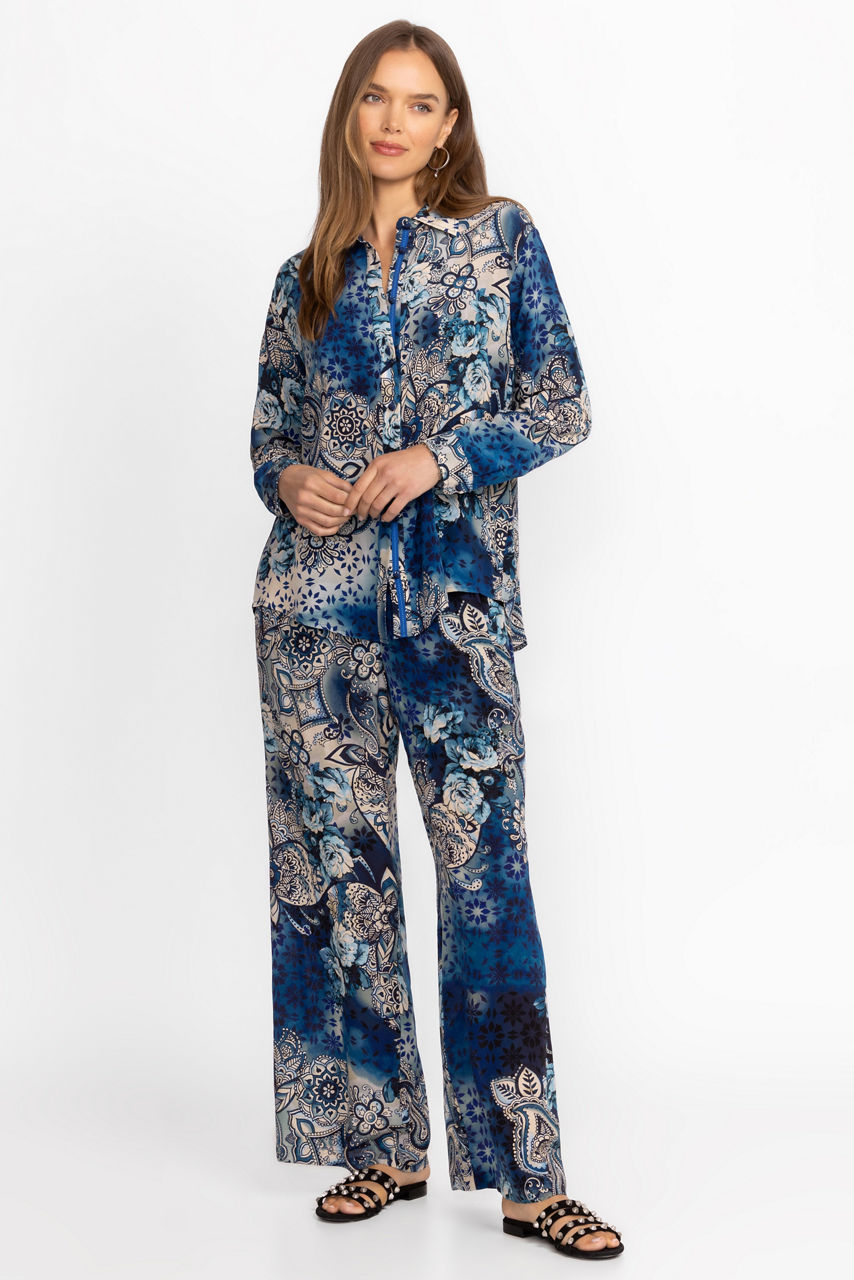 Crafted from 100% luxurious silk, the Smocked Waist Pants are both versatile and functional. Featuring an elastic waist and slip pockets at the hips, these relaxed-fit, wide-leg pants are adorned with a brilliant blue, eye-catching pattern. Pair with a white silk cami and strappy heels for a night out.