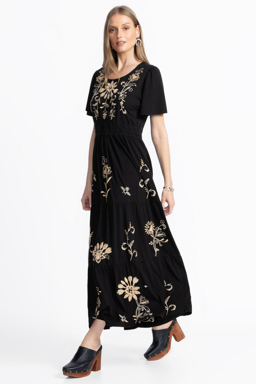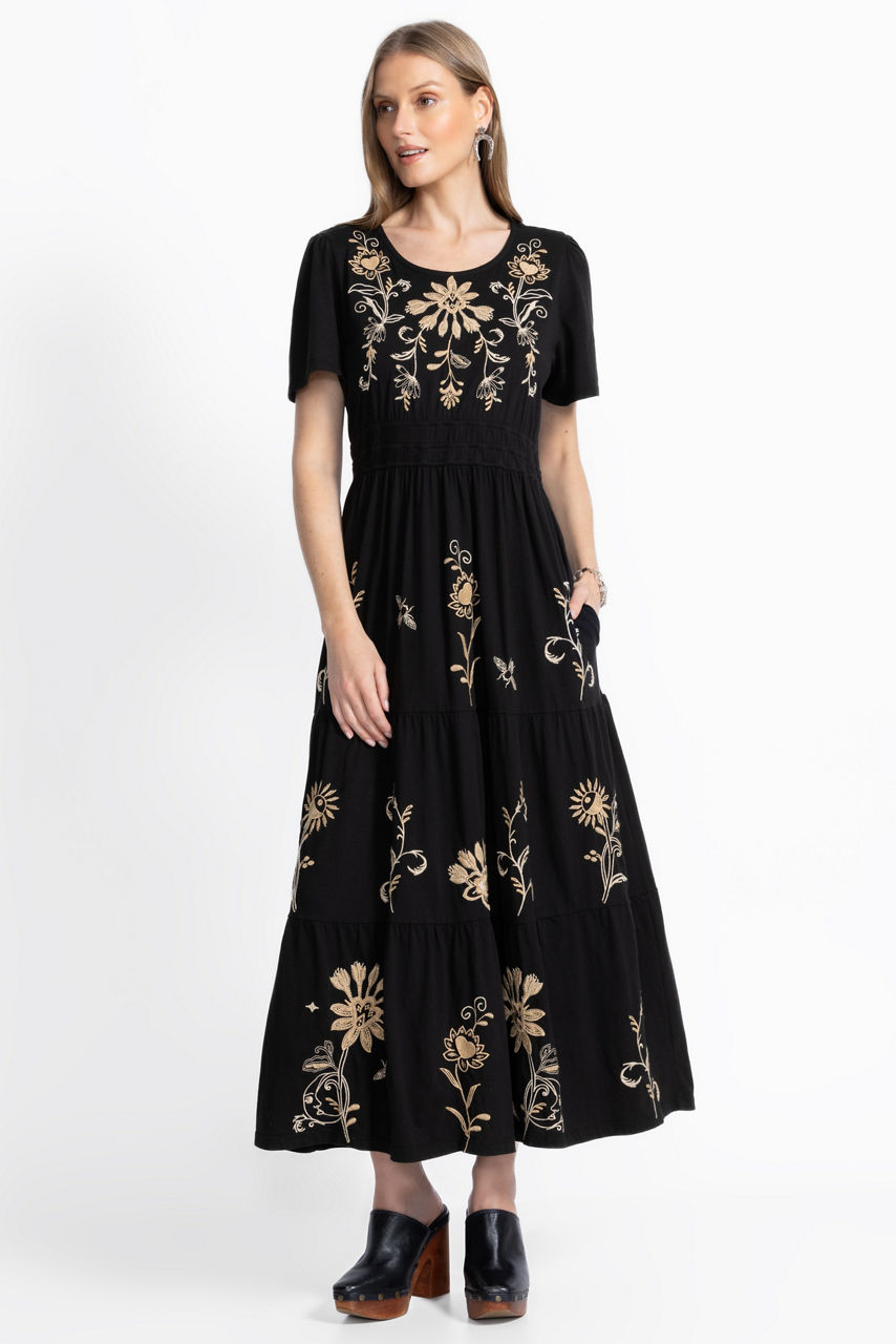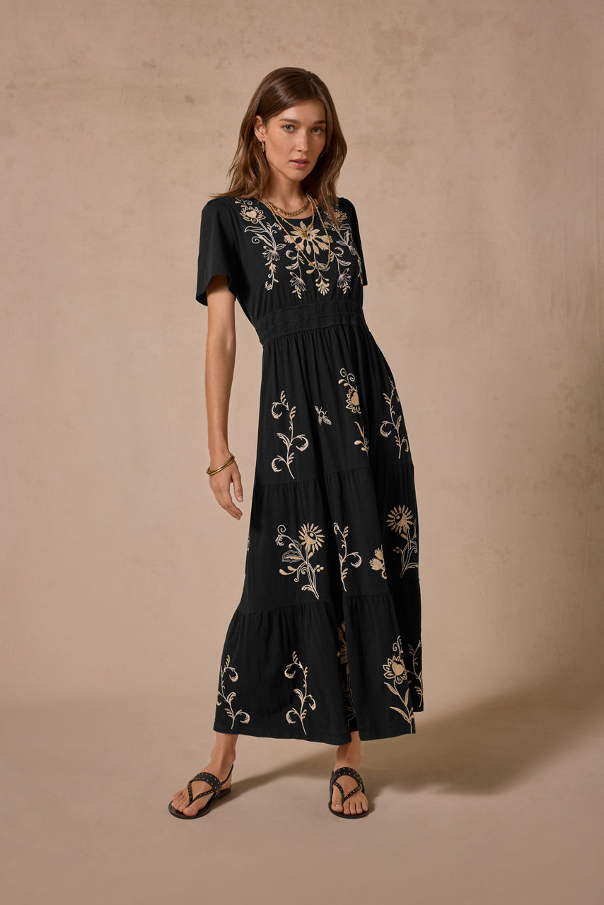 Crafted from 100% breathable cotton, the Smocked Waist Tiered Midi Dress is embellished with vibrant embroidered details. Designed with a rounded neckline and a keyhole back, this unique dress is finished with an elastic waist and a tiered midi skirt. Pair with kitten heels and eclectic jewelry pieces for an evening out.
