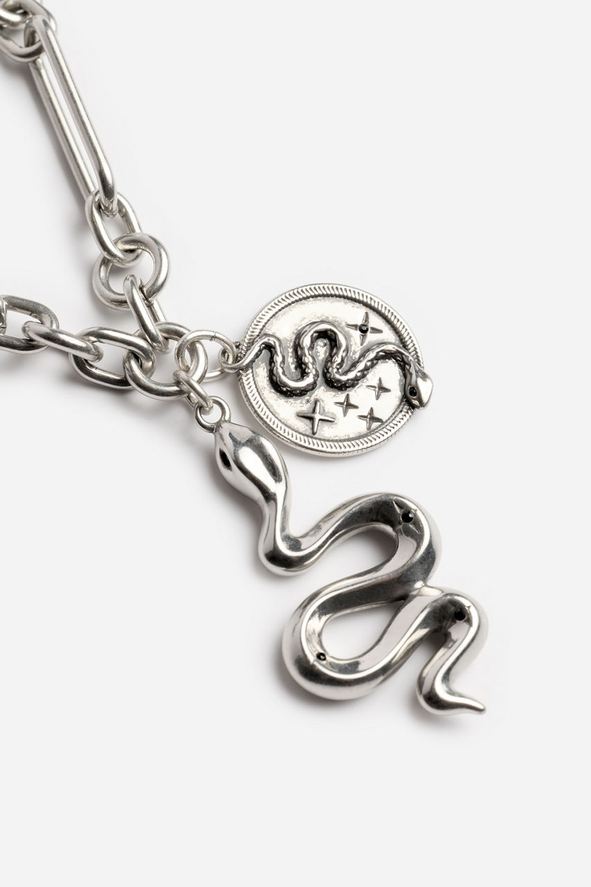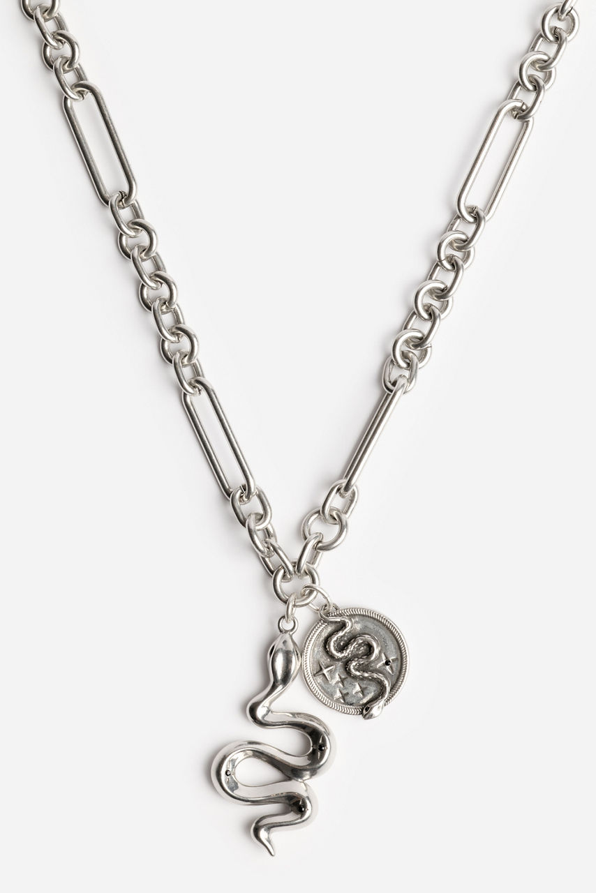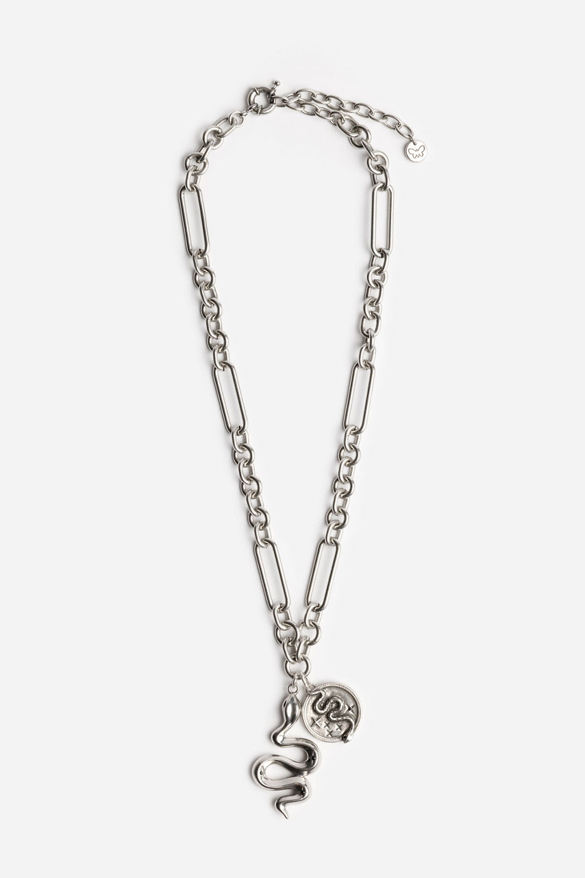 Beautifully crafted in rich silver-tone metal, the Snake Charm Necklace adds a touch of whimsy to any look. Designed with a bold paperclip chain, this necklace is accented by an engraved snake charm and a stunning snake pendant. Pair with a black wrap dress and bold silver bracelets for a perfectly coordinated evening look.