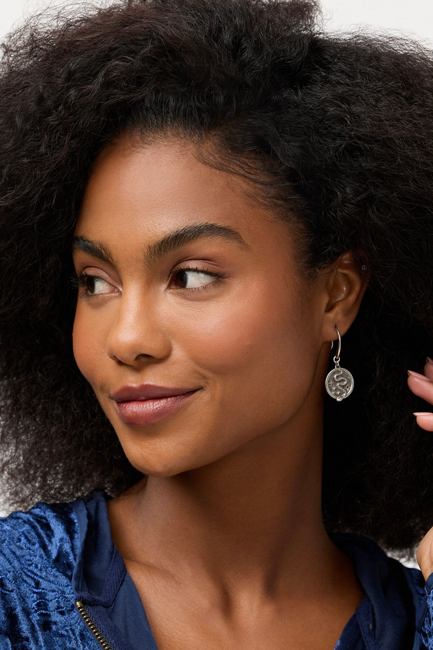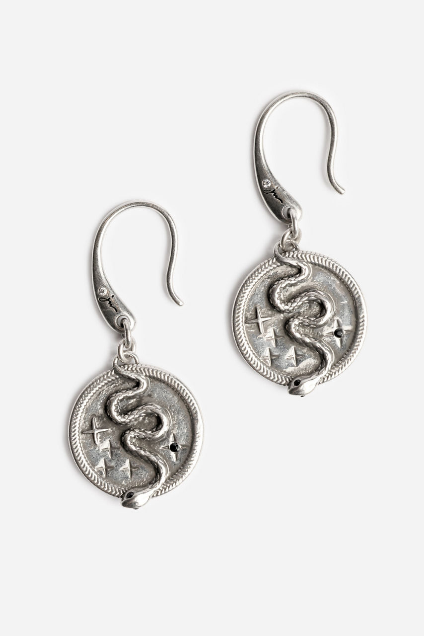 The Snake Coin Drop Earrings are crafted in a rich silver-tone and are perfectly sized to make a statement. Designed with a silver coin pendant featuring a snake shape and intricate celestial detailing, these bold earrings are a conversation starter. Pair with the Snake Charm Necklace and Budhagirl Silver Stack Bracelets for a perfectly coordinated jewelry look.