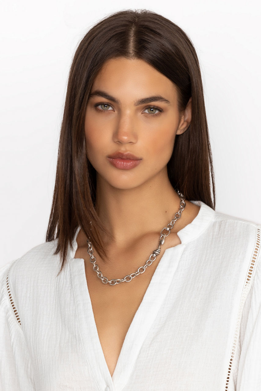 Bold and versatile, the Snake S Hook Chunky Necklace adds a touch of shine and style to your look. Specially crafted with a detailed silvertone S-hook closure in the shape of a snake, this eye-catching necklace is highlighted with large open links for a rich eclectic feel. Add to a classic little black dress and silver metallic heels for a perfectly coordinated evening look.