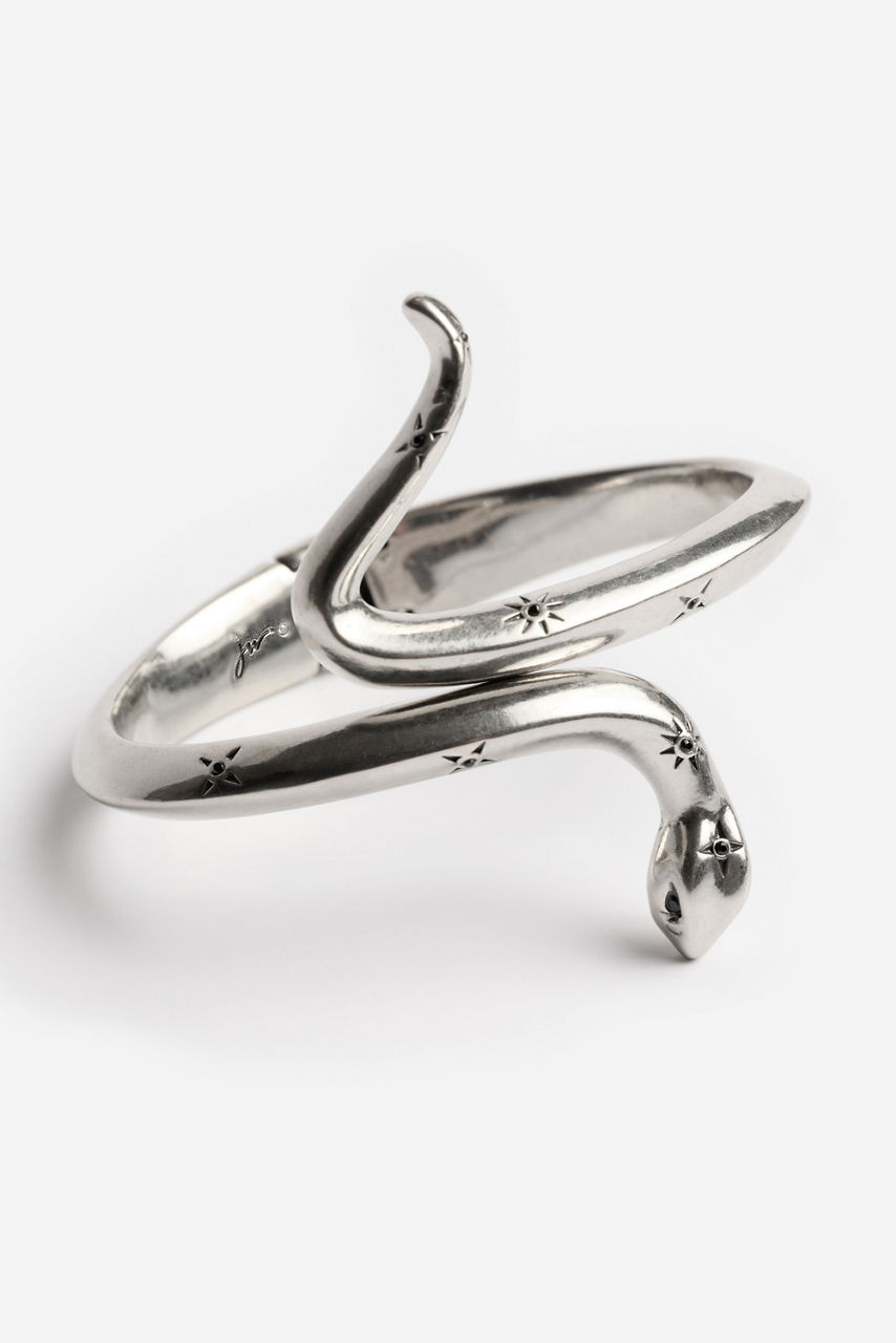 Beautifully designed in a rich silver-tone, the Snake Hinged Cuff is equal parts beauty and mystery. Designed in the shape of a slithering snake and embellished with glittering black stones, this bracelet features a hinge closure for easy wear and removal. Pair with the Snake Coiled Studs and wear with a classic black dress for a fresh evening ensemble.