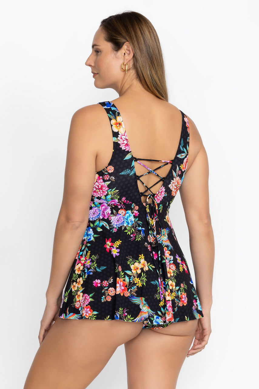 A feminine swimwear silhouette, the Sognatore Nero Back Tie Skirted One Piece boasts vibrant blooms on a rich backdrop. Featuring a deep V-neckline and flowing skirted bottom, this one-piece swimsuit is crafted from a unique fabric that blocks 99.5% of UV rays. Layer with a flowing kimono and add a beach tote for a perfectly put-together surfside look.