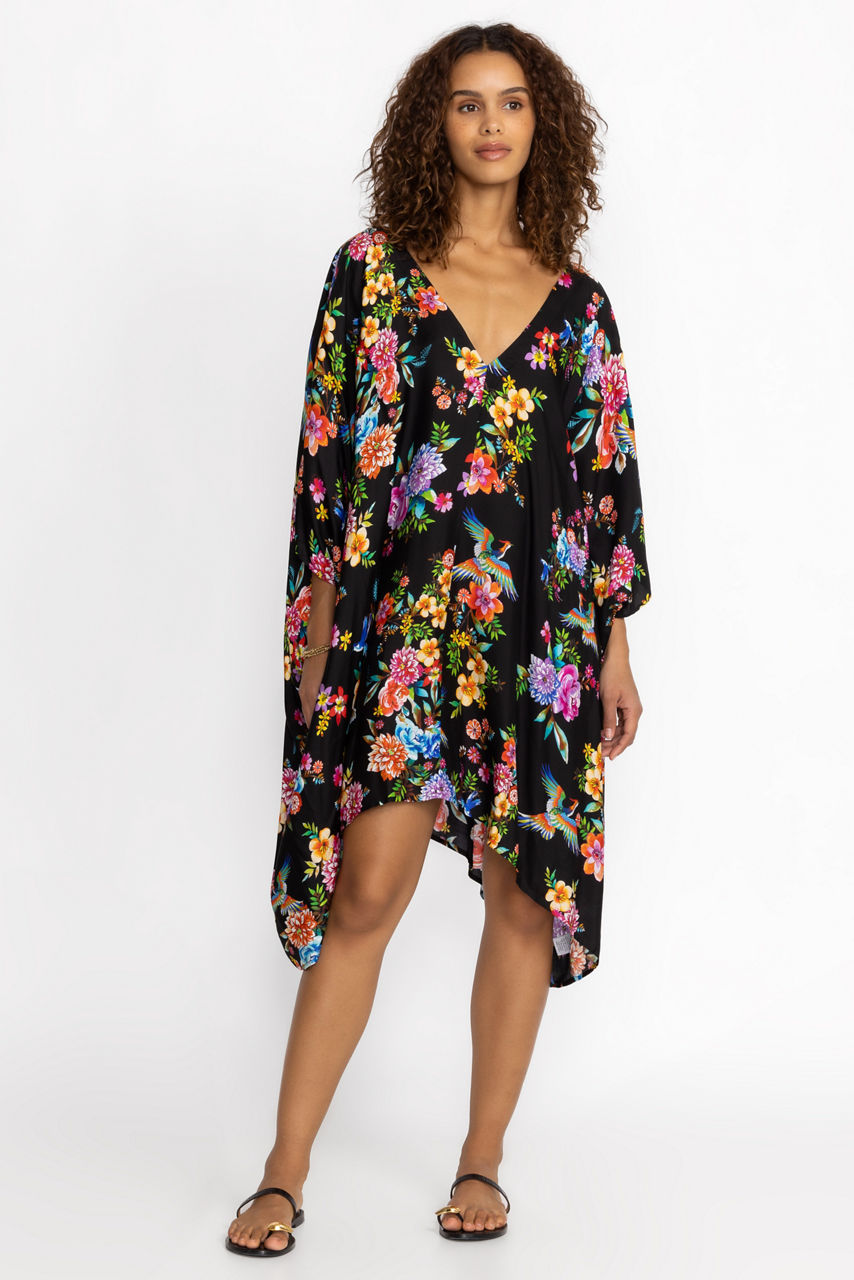 Crafted from a billowing silk blend, the Sognatore Nero High Low Kaftan is an elegant look for poolside relaxing. Featuring a V-neckline at both the front and back, this easy-care kaftan creates an elevated resort-ready style. Layer over the Sognatore Ruched One Piece and finish with simple leather slides to complete the look.