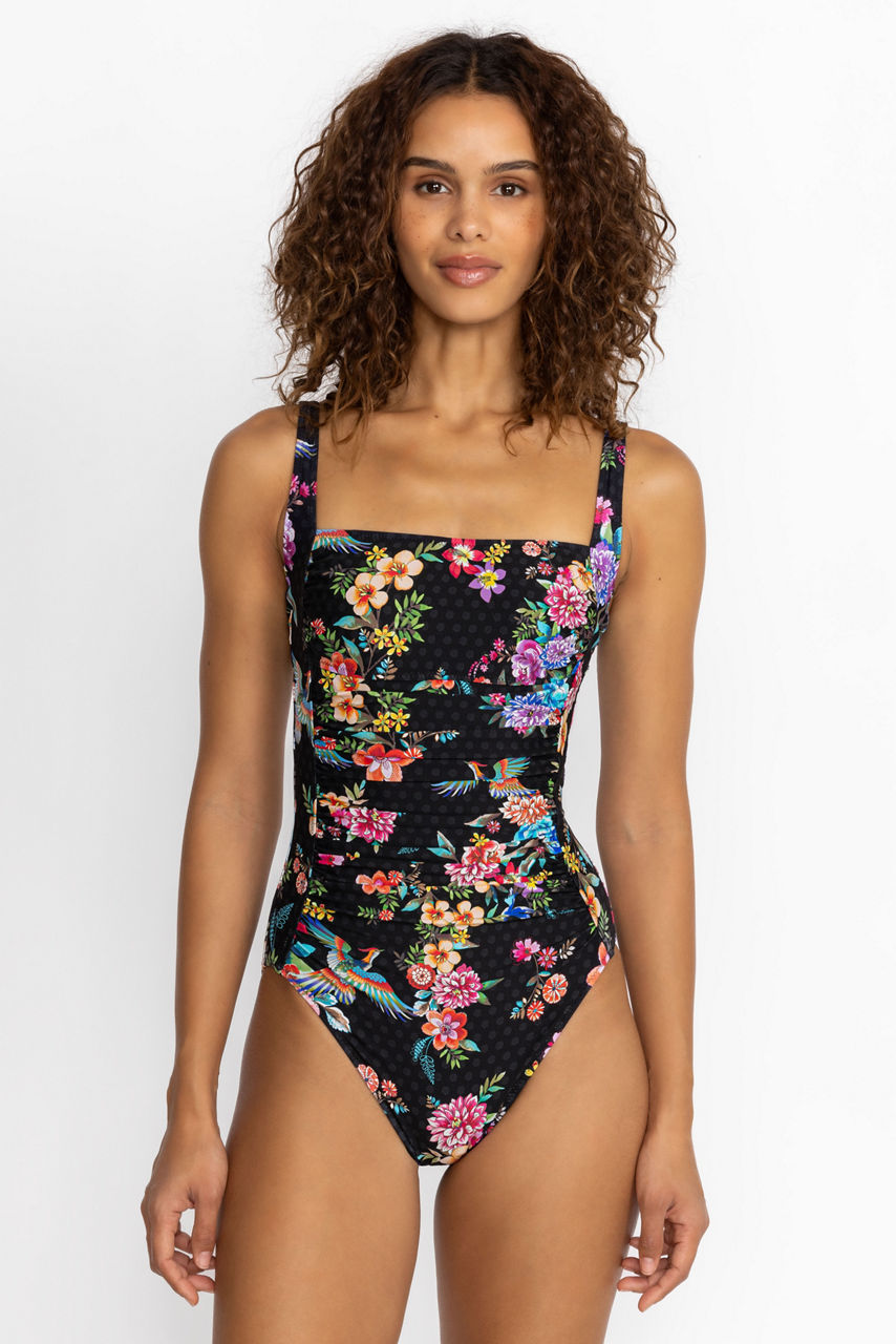 The Sognatore Nero Ruched One Piece embodies chic and effortless style with its bold floral patterns. Featuring a square neckline and wide shoulder straps, this bold suit is crafted from a performance fabric that blocks 99.5 % of harmful UV rays for additional protection from the sun. Layer with a white button-down linen blouse for a breezy combination to enjoy on your next sunny getaway.