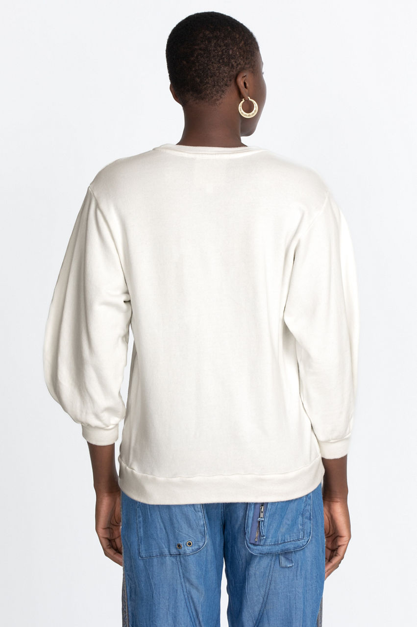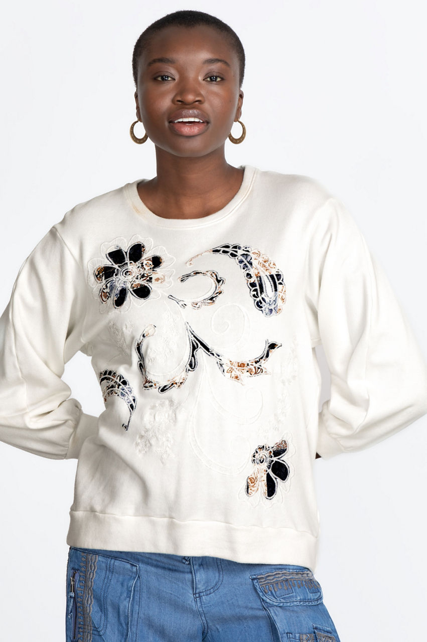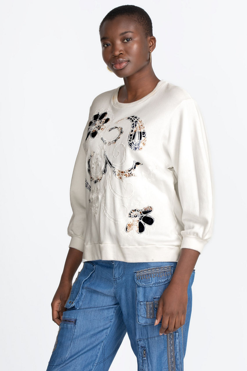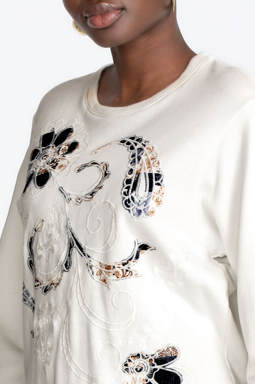 Every woman needs comfortable yet feminine outerwear. Our Solis Crew Neck is exactly what you need. With a background of antique white or true navy, our terry shirt with ribbed sleeves and waist will keep you warm and cozy. Our front pattern of stylized paisleys and flowers in soft blues and gold pairs well with your favorite comfortable jeans and warm, fuzzy socks. Our Solis Crew Neck would be equally at home with dark-washed jeans and low-heeled boots for casual outings.