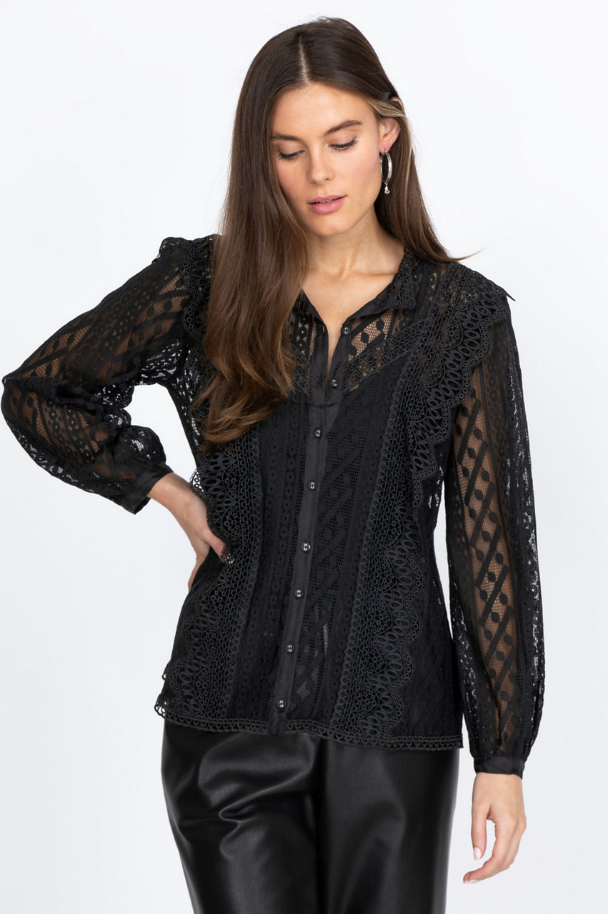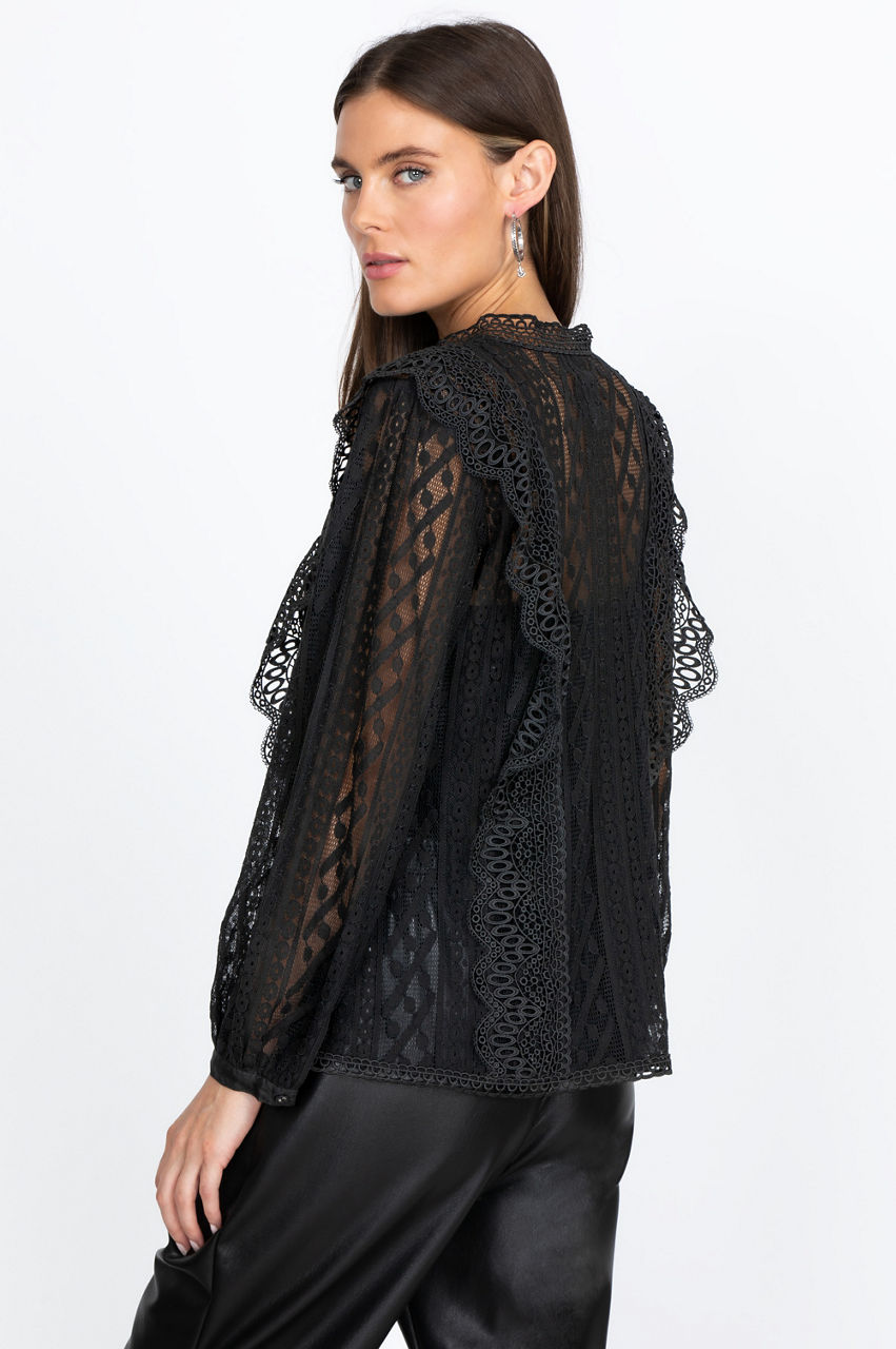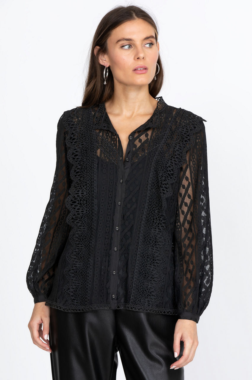 Our Soluna Lace Blouse is sure to become a favorite. Black lace accentuates delicate black-on-black geometric designs, and a separate cami provides just the right amount of coverage. The full sleeves gather at your wrists, and the short standing collar is a particularly attention-stealing design choice. Keep your jewelry to a minimum, perhaps only drop earrings, so that your aesthetic really shines in your Soluna blouse.