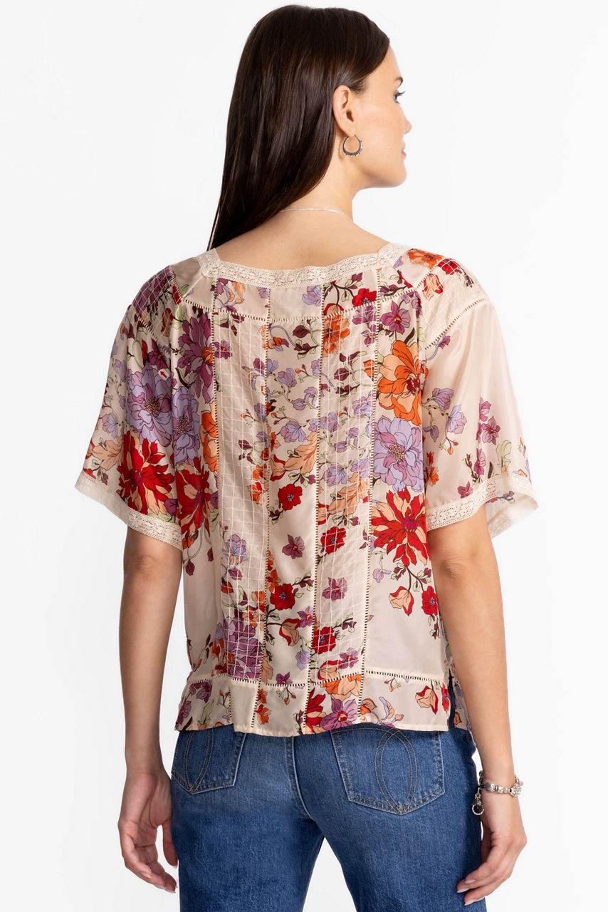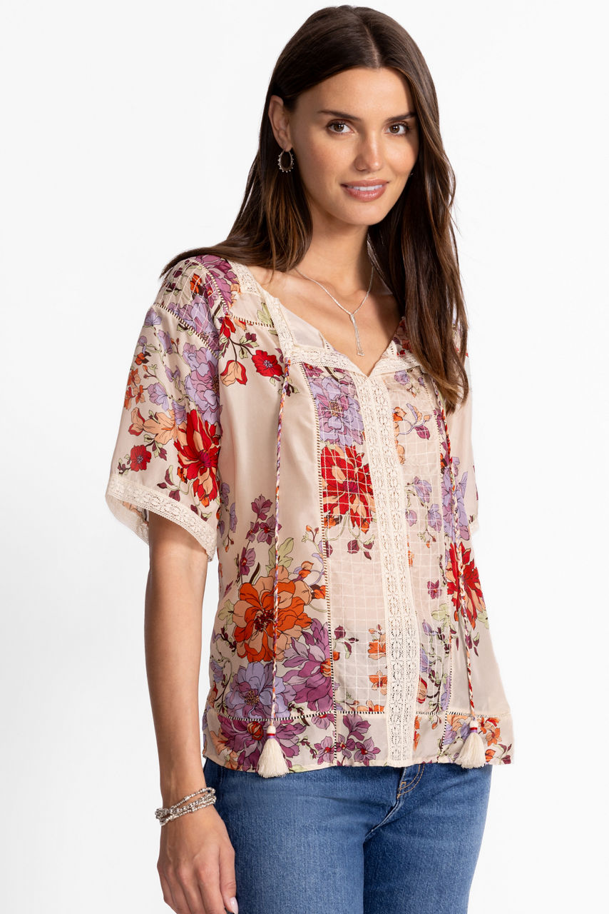 Beautifully adorned with a rich floral pattern and structured with intricate seaming, the Sonia Lace Blouse is crafted from sumptuous 100% silk. Designed with a square neckline with a tie and tassels, this feminine blouse is finished with lattice trim and delicate floral lace. Paired with a tiered skirt and sandals for a resort-inspired casual look.