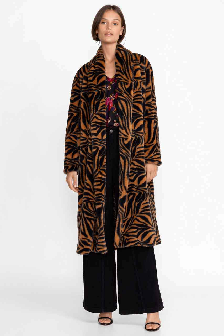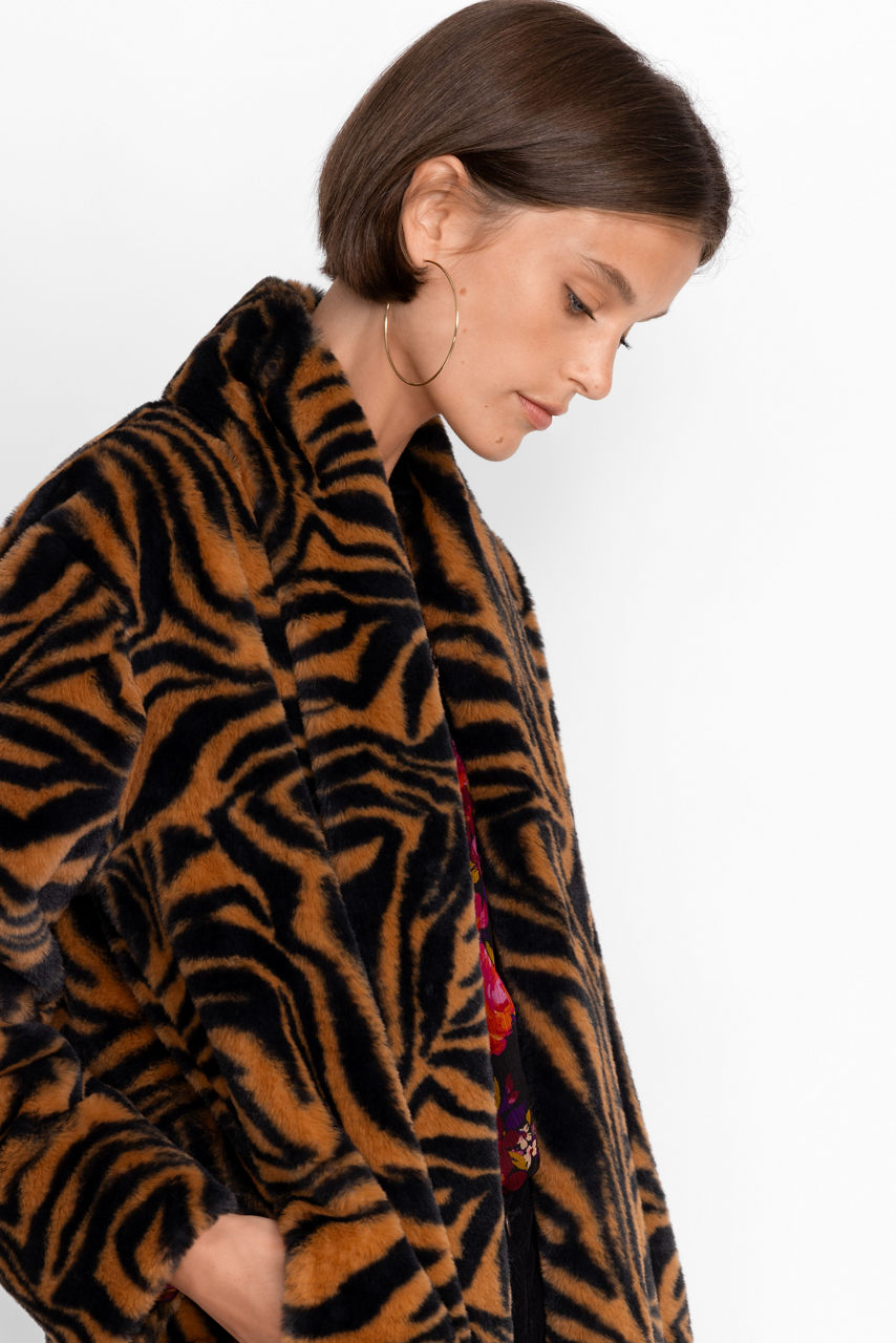 Steeped in unrivalled 70s charm, the Sonora Faux Fur Long Coat adds a statement touch to cold-weather practicality. Made from insulating faux fur, this long coat boasts long sleeves, a lining, pockets, and a brown and black exotic pattern. Style this coat with everything from bias-cut dresses to dark denim and knitwear.