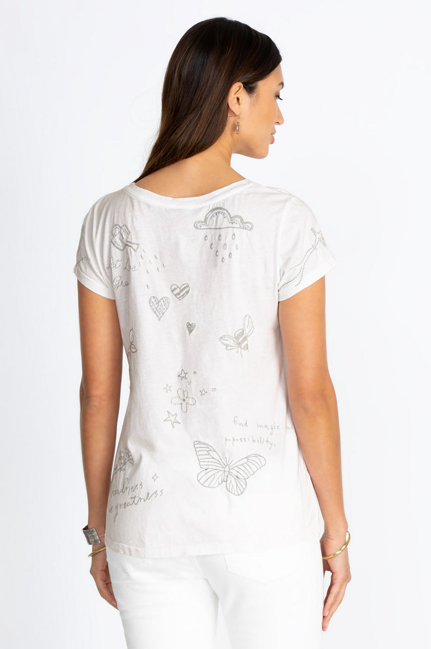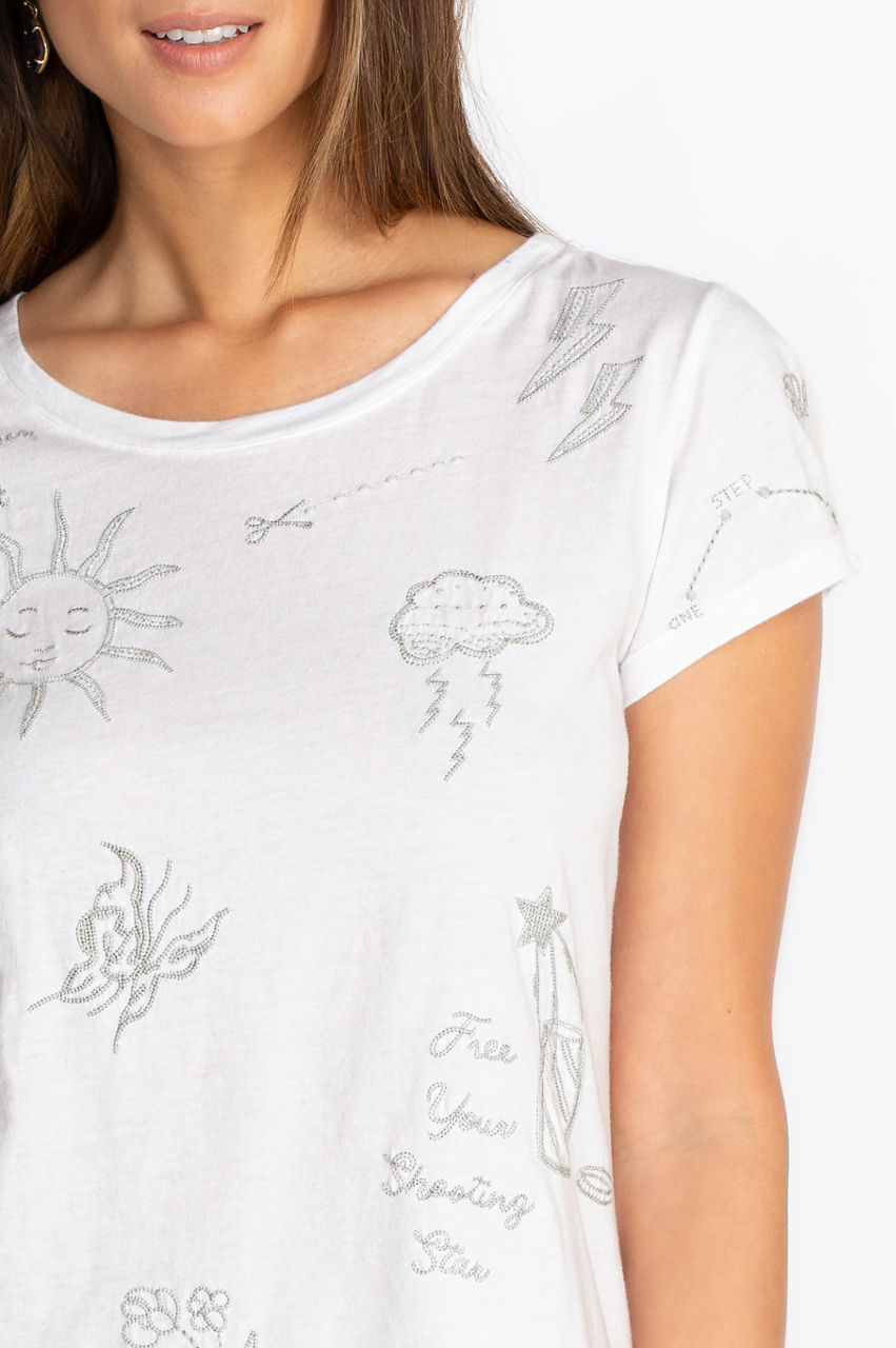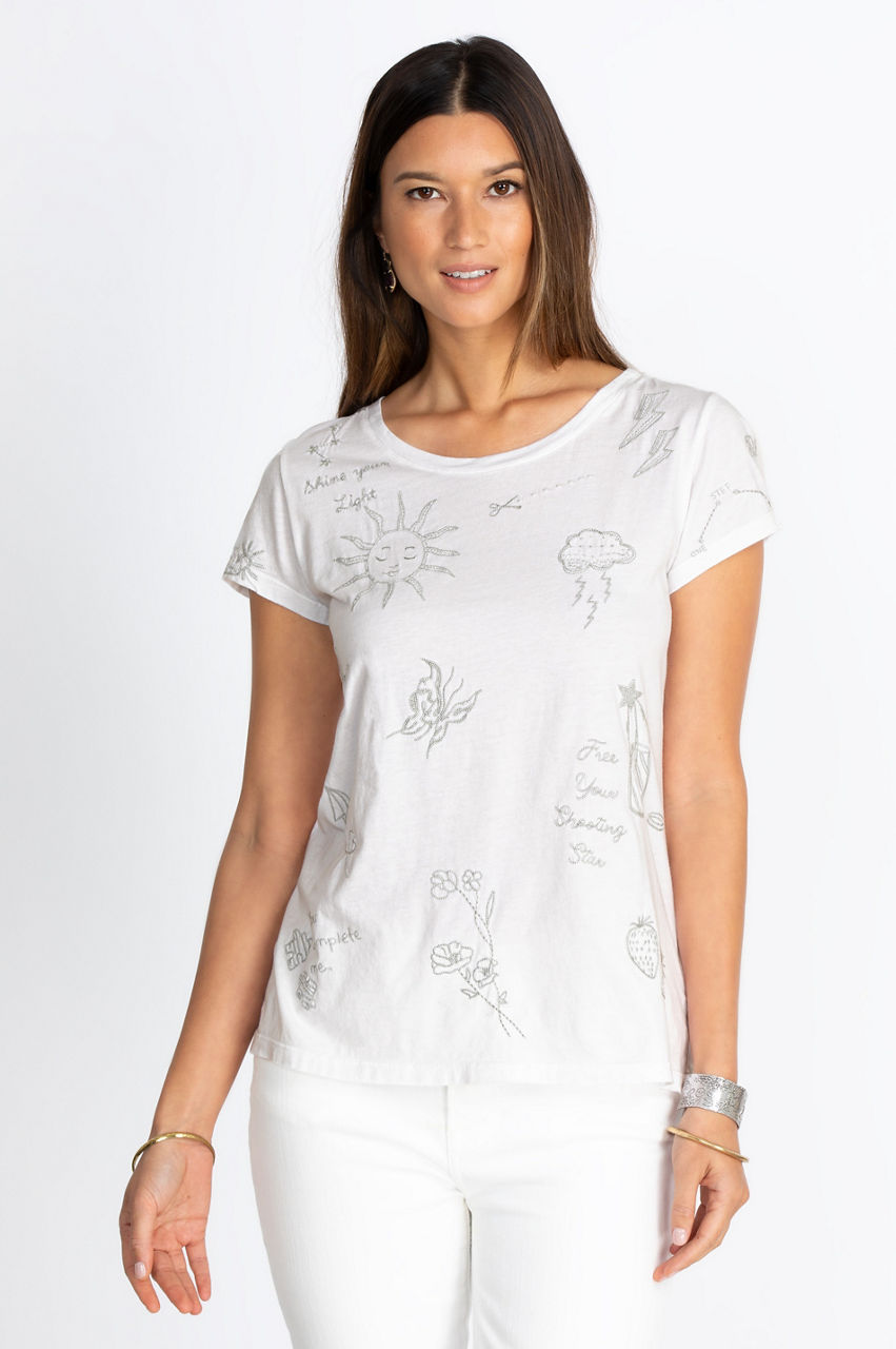 This classic short sleeve tee will soon become a staple of your wardrobe. The round collar and cap sleeves create a delicate fit that elevates this simple look. The fun motif of the Sovanna Cap Sleeve Tee will help you create outfits that stand out, whether you wear this shirt with classic straight jeans or create an active look with some comfortable leggings.