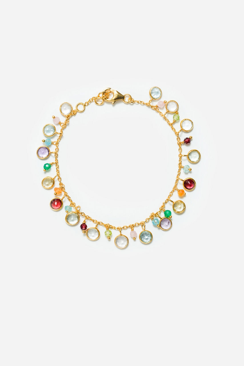 Sparkling and brilliant, the Sparkling Charms Bracelet adds shine and texture to any look. Handcrafted from sterling silver with 18k gold plating, this unique bracelet is embellished with a variety of colored stone charms and is finished with a traditional clasp closure. Pair with casual or upscale wardrobe items to enjoy this versatile jewelry piece.