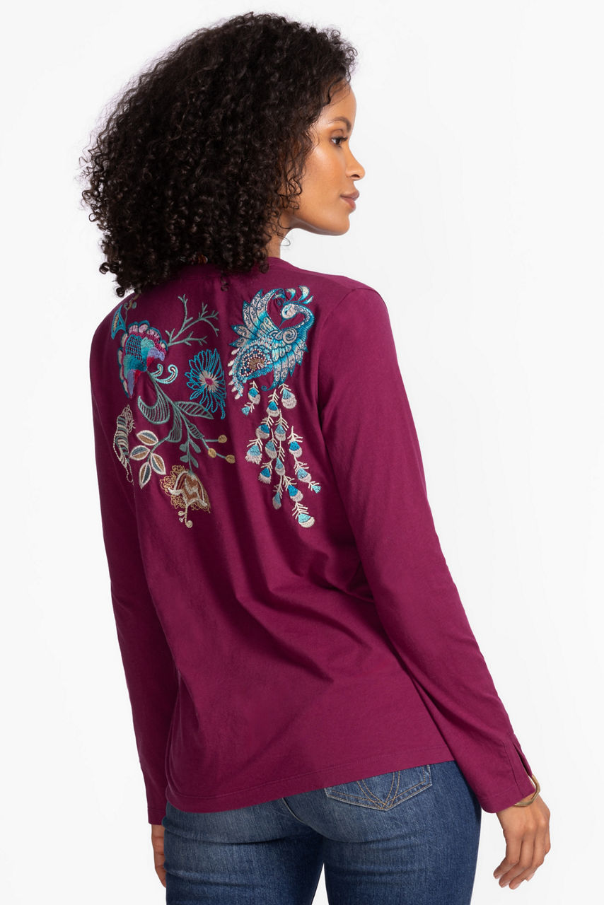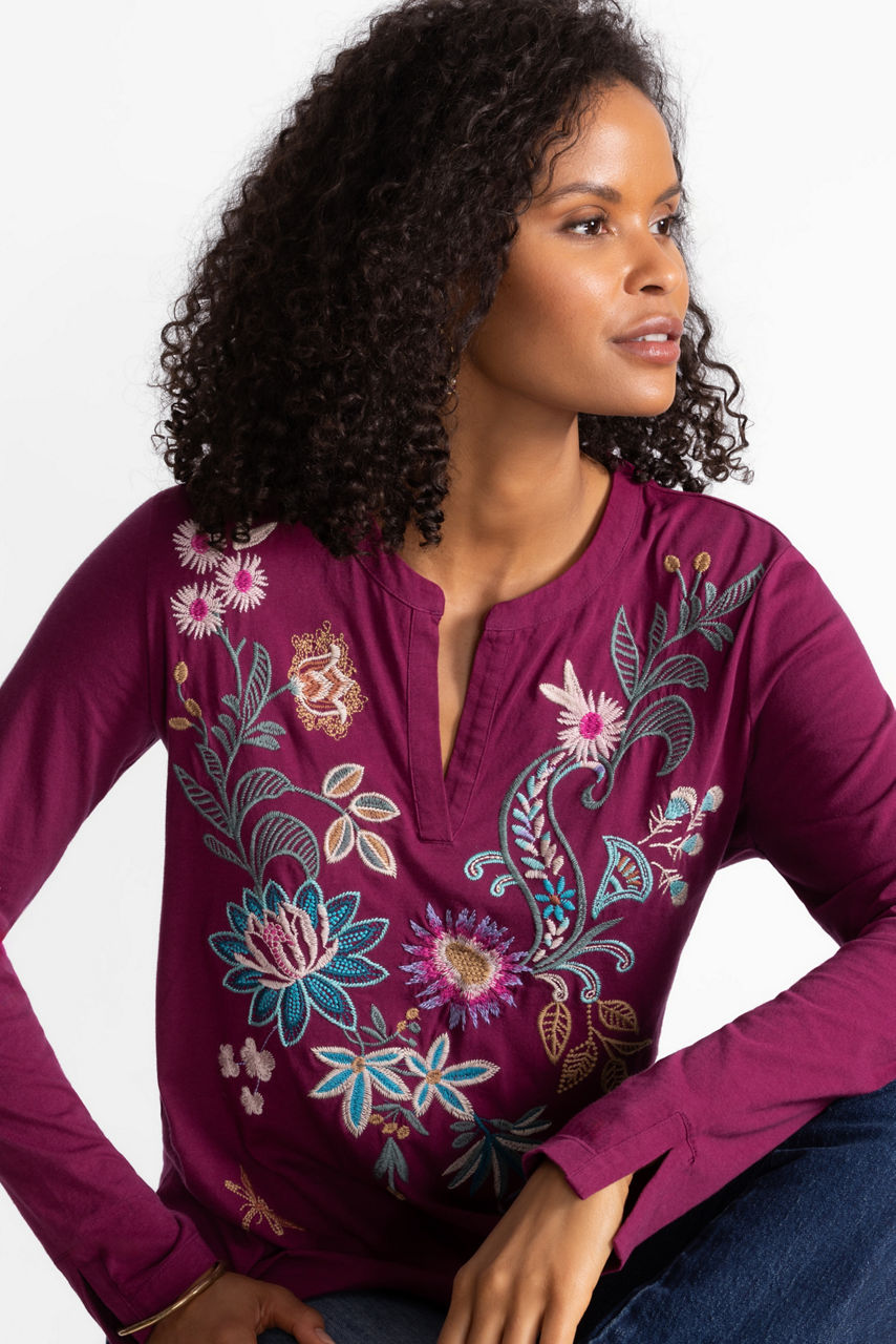 The Edwin Split Jersey Tee is crafted from breathable 100% cotton and is embellished with vibrant embroidered floral blooms. Designed with a split V-neckline and long sleeves, this unique tee is finished with split cuffs for a tailored look. Pair with a denim skirt and fashion sneakers for a day sightseeing on vacation.