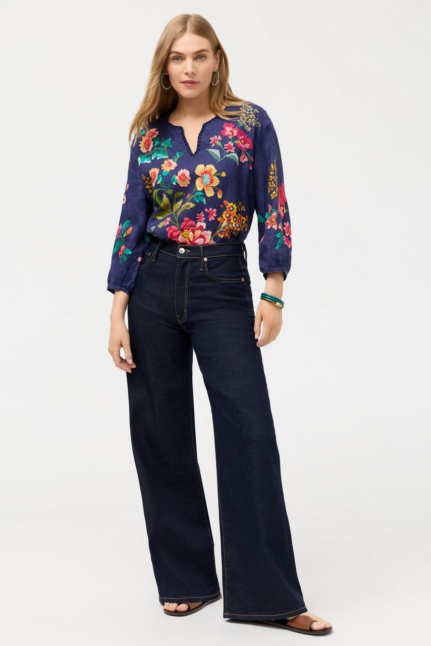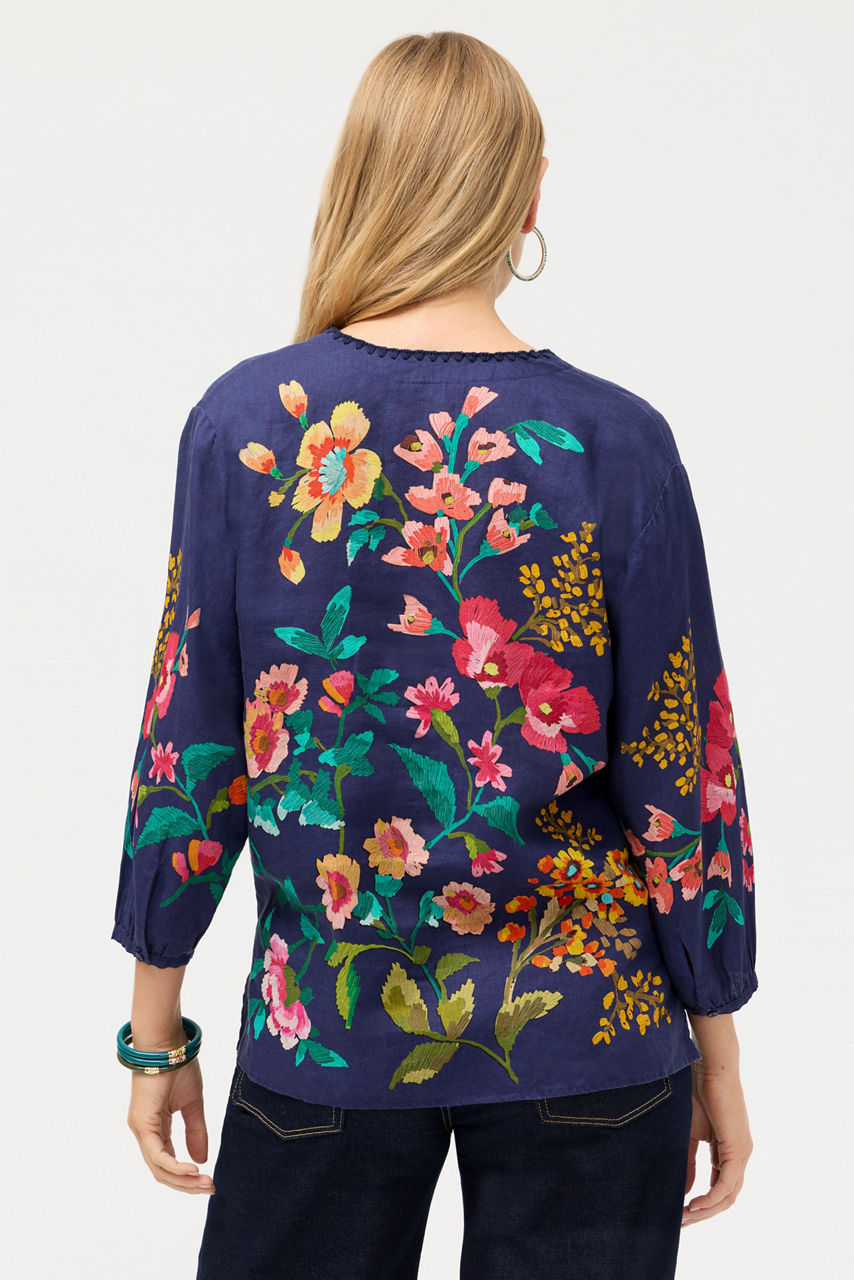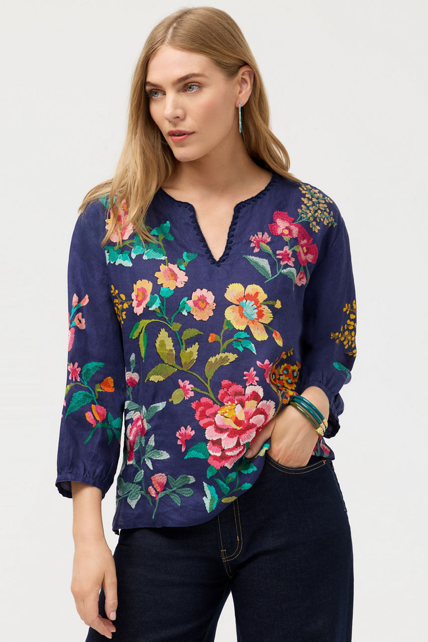 Crafted from rich 100% linen, the Split Neck Linen Blouse is embellished with bold florals for a vibrant splash of color. Designed with a split V-neck and gently puffed bracelet-length sleeves, this colorful blouse is finished with intricate placement embroidery. Pair with relaxed-fit denim and coordinating flats for a polished casual look.