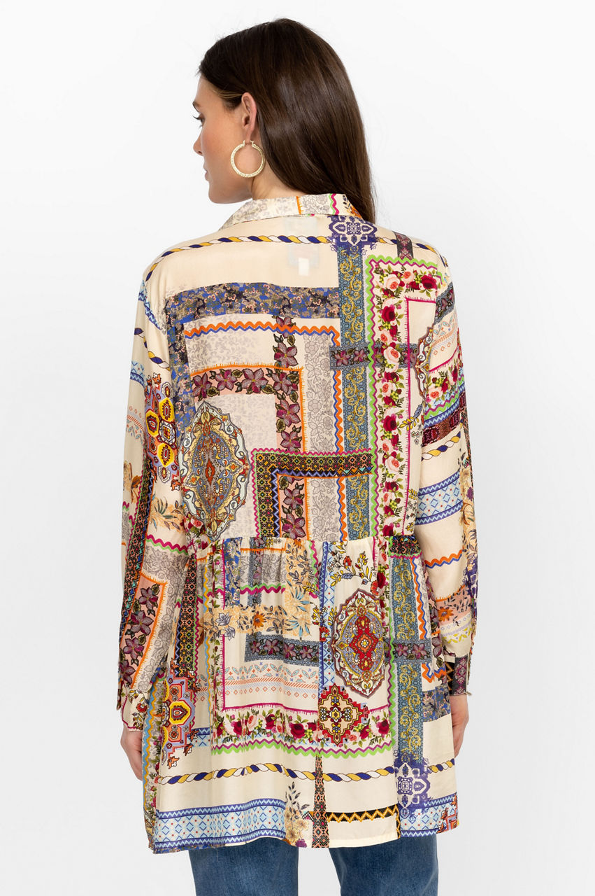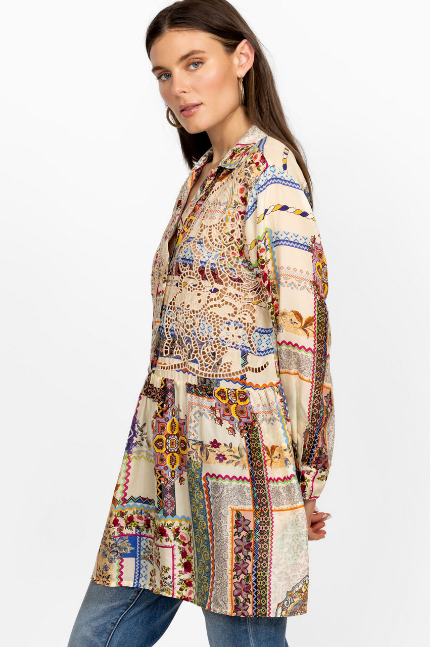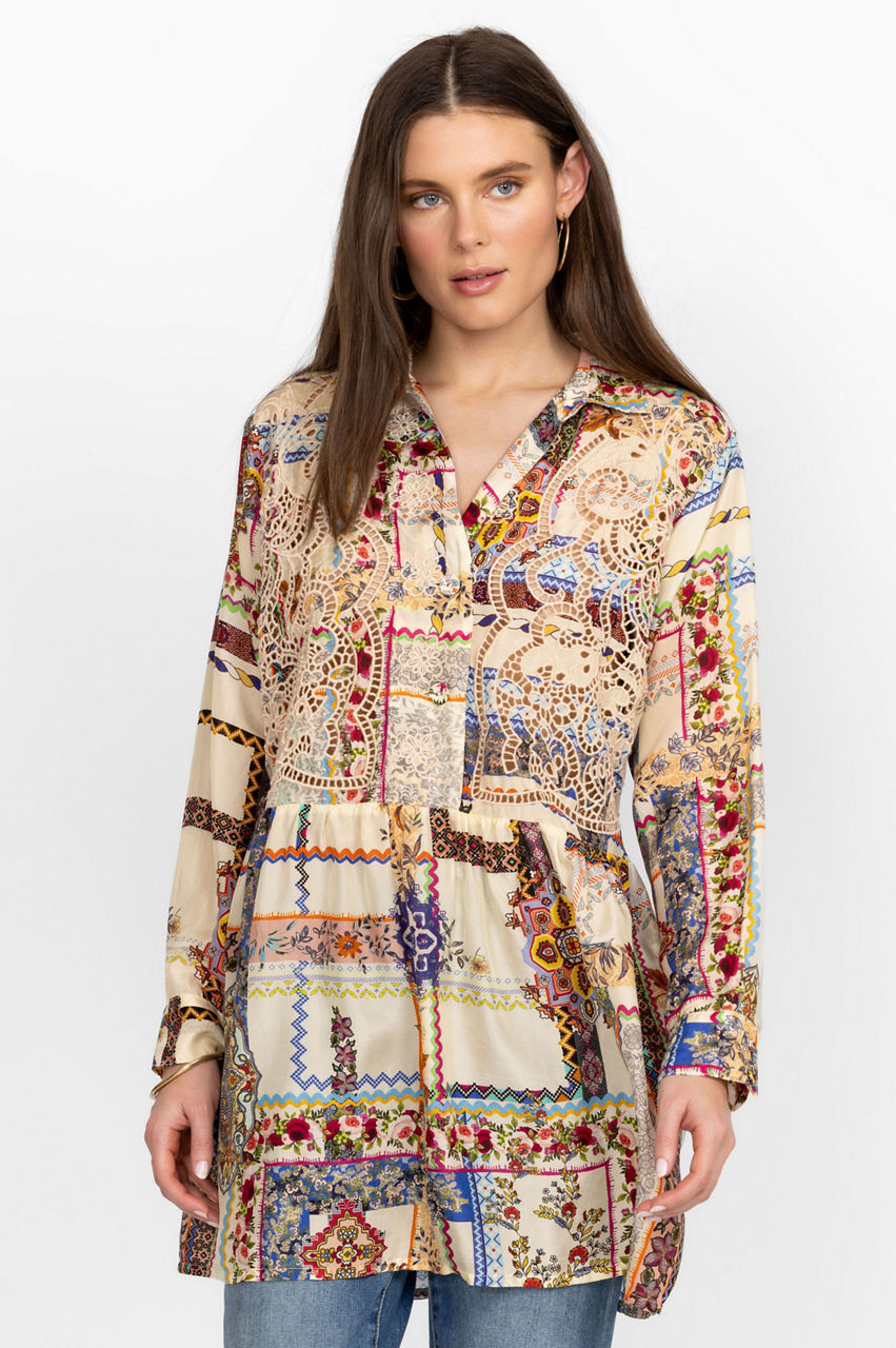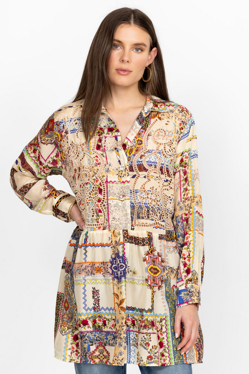 The Stano Monroe Tunic captures the ease of new season dressing with an eclectic twist. Enhanced by an assortment of colors and patterns, this tunic has been spun from liquid-like silk and boasts a collar, long sleeves, a placement eyelet embroidery and a mix of prints and eye-catching motifs. Layer over denim to channel a classic bohemian look.