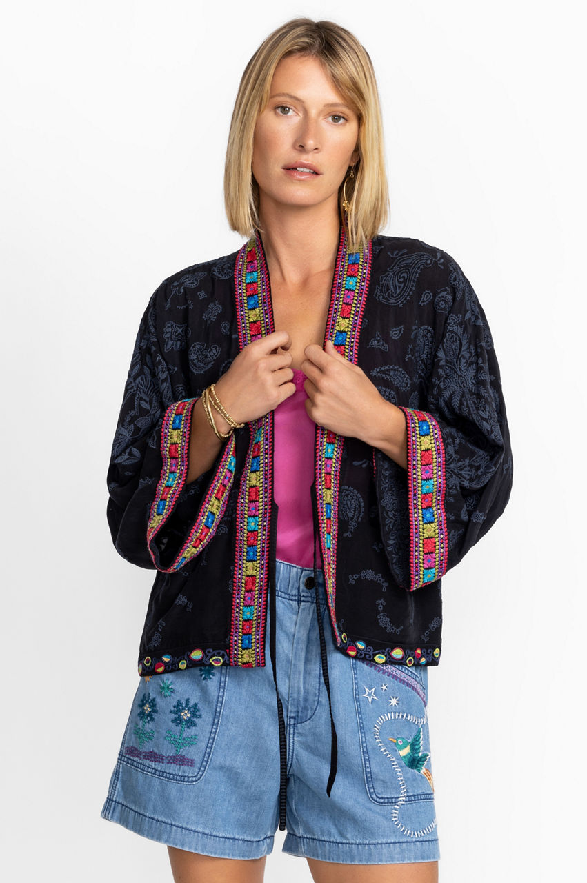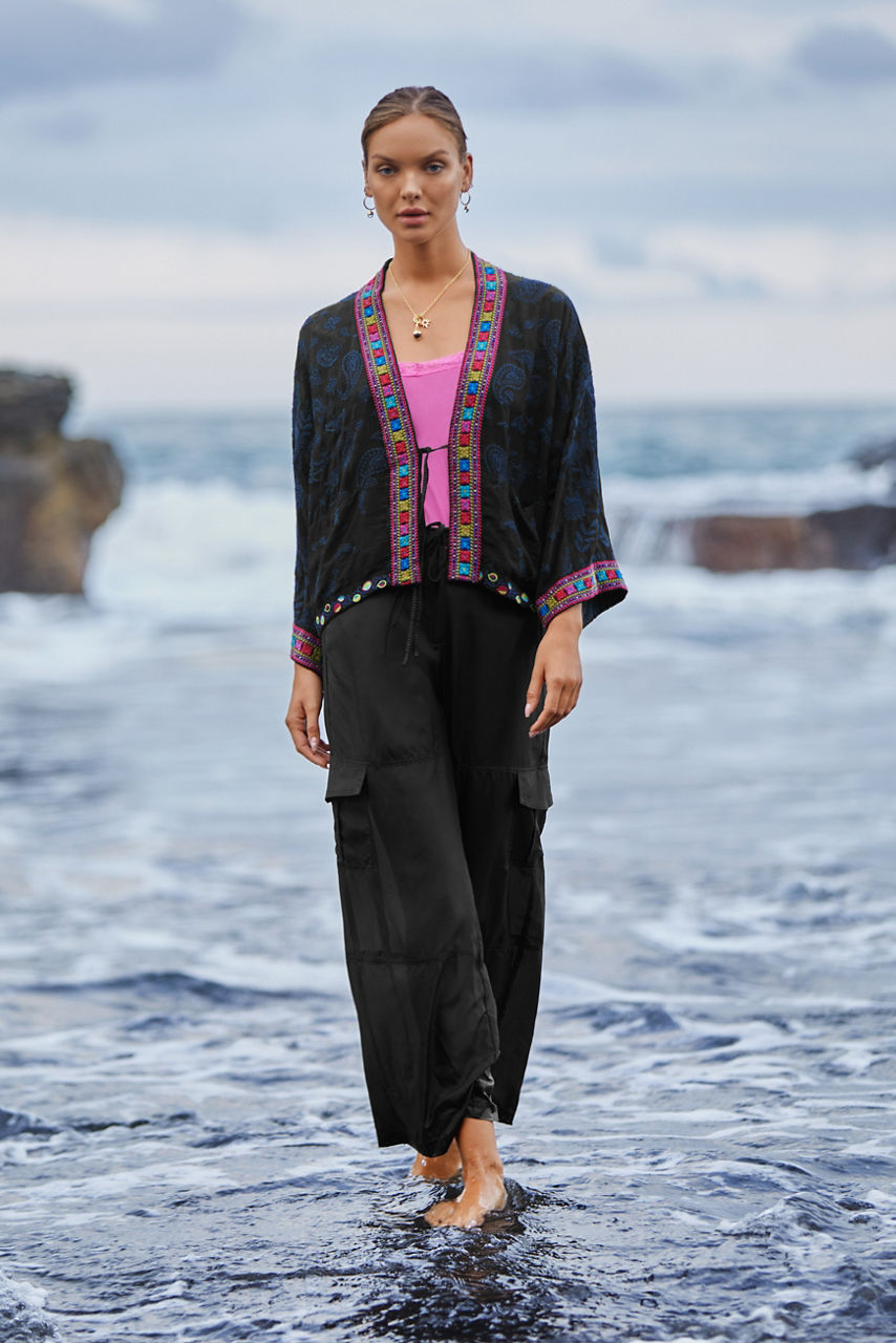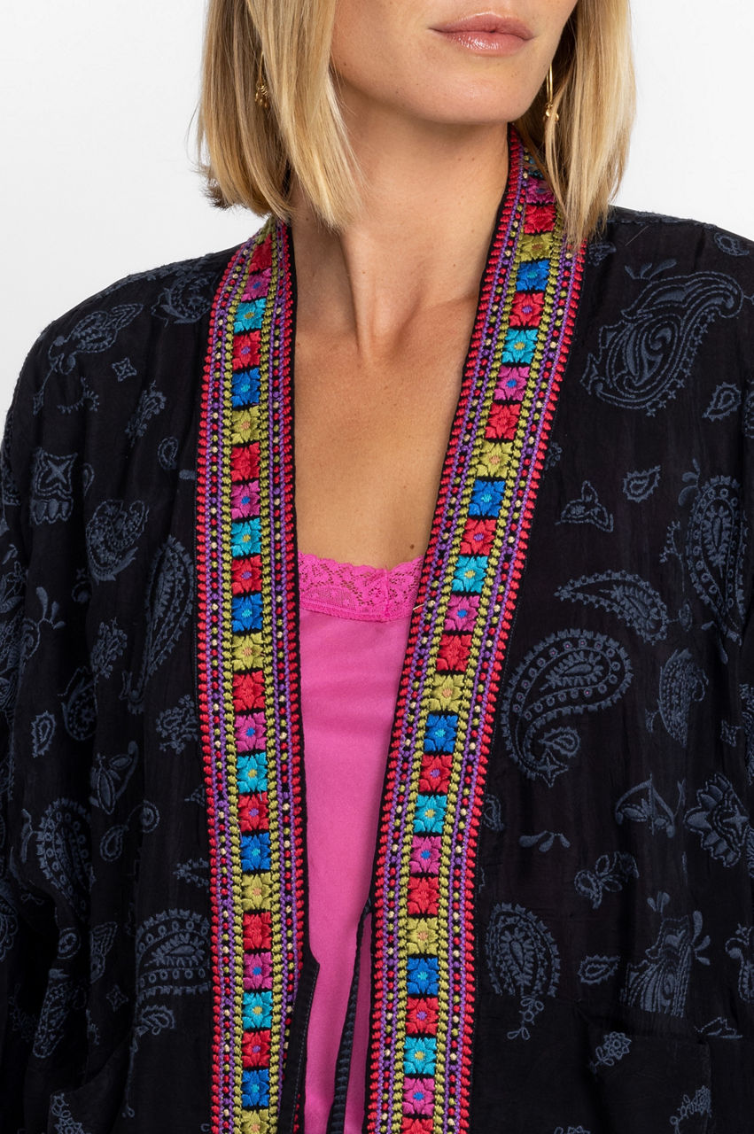 Underscored with an antique feel, the Star Danica Kimono adds a luxe touch to after dark ensembles. This kimono is crafted from a lightweight material and features pockets, long sleeves, a tonal pattern, and colorful trims along the edges for an artistic finish. For an eye-catching evening ensemble, wear this kimono with a silk dress or smart tailoring.