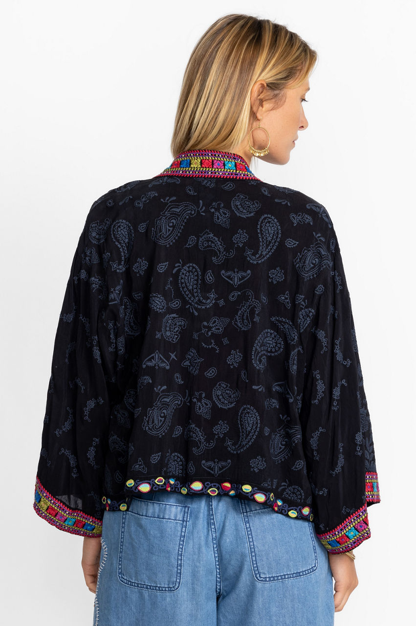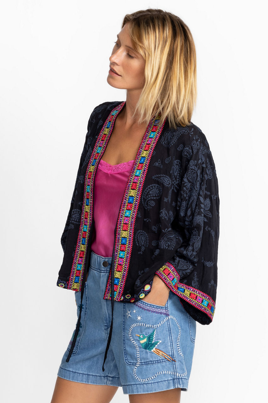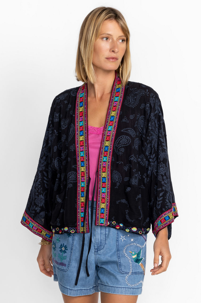 Underscored with an antique feel, the Star Danica Kimono adds a luxe touch to after dark ensembles. This kimono is crafted from a lightweight material and features pockets, long sleeves, a tonal pattern, and colorful trims along the edges for an artistic finish. For an eye-catching evening ensemble, wear this kimono with a silk dress or smart tailoring.