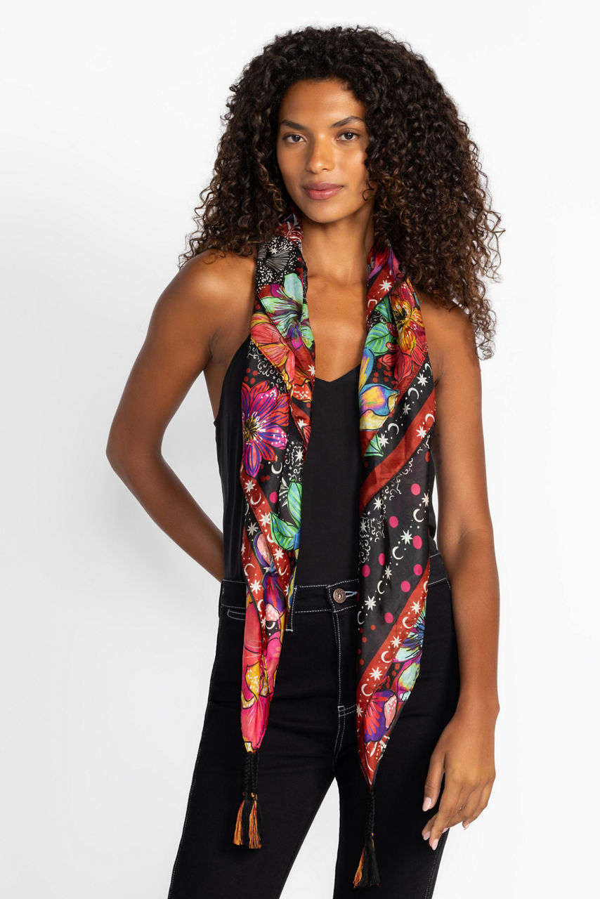 Crafted from 100% stunning silk, the Starry Night Silk Scarf is rich in color and pattern. Thoughtfully designed with an eye-catching pattern to enhance any look, this flowing scarf is finished at each corner with a decorative tassel for added texture. Tie at the neck or add to the handle of a classic handbag for a splash of color.