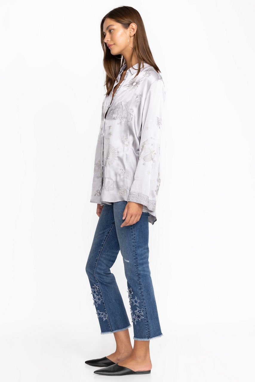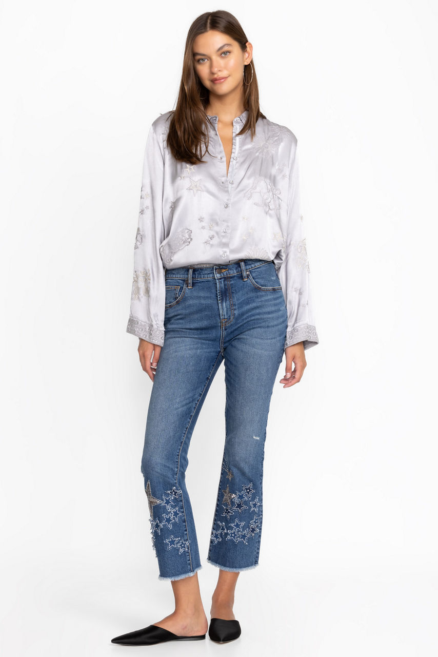 Serving up a celestial look, the Stars Dance Cropped Baby Boot Jeans offer a vintage wash and all-day comfort. Crafted from a cotton blend with a hint of stretch, these cropped jeans feature intricate applique stars decorating the hemline. Pair with a white silk blouse and glittering silver jewelry for a polished casual look perfect for a night out.