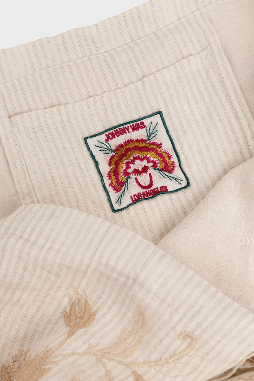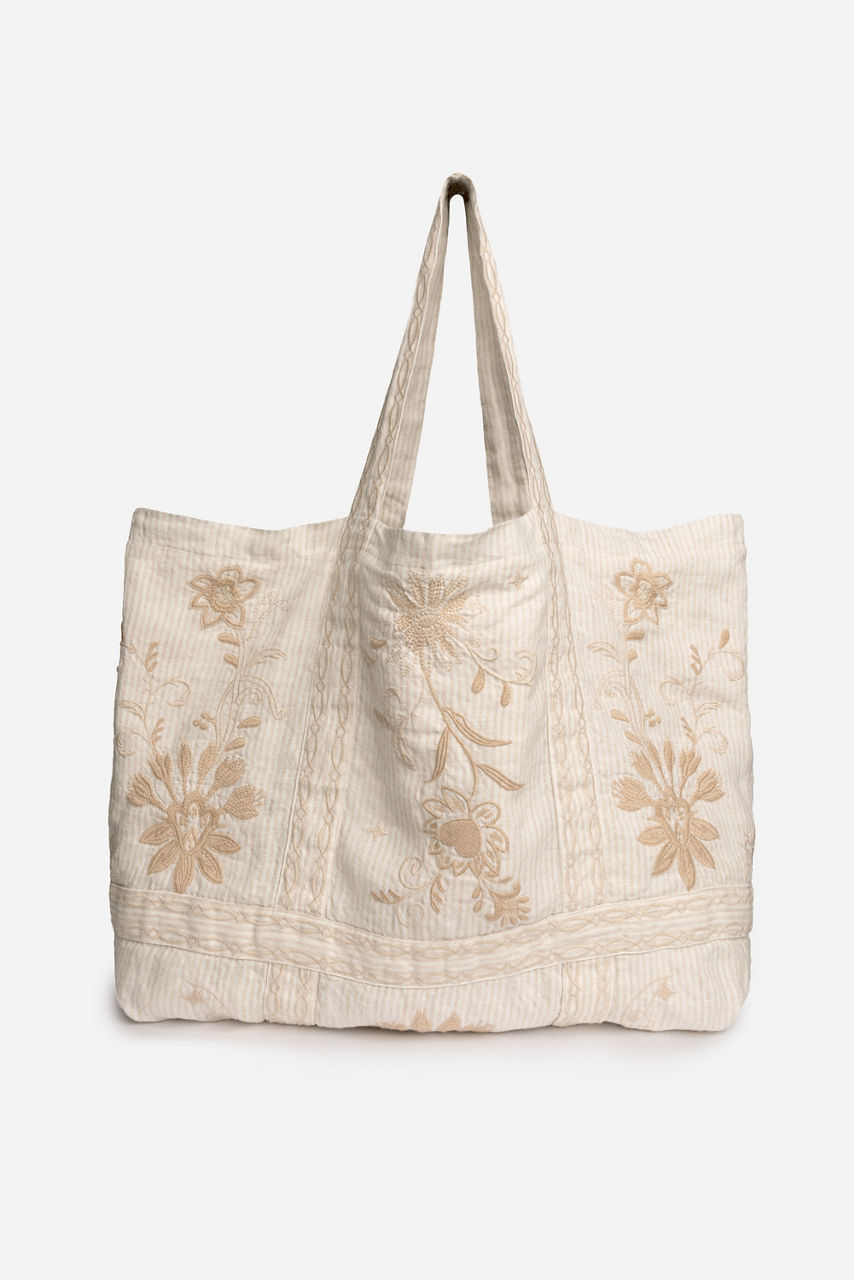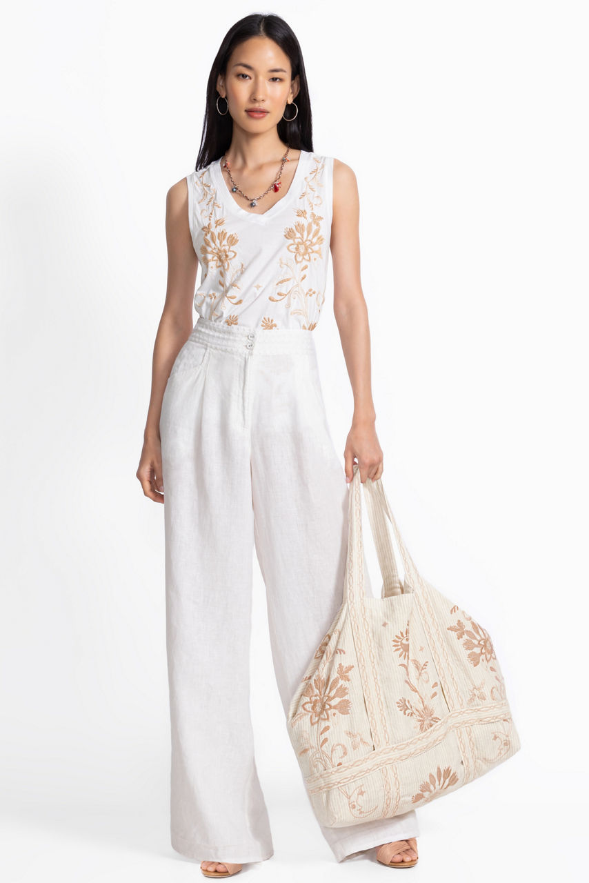 The Strappy Beach Tote is crafted from 100% linen and features intricate tone-on-tone embroidered floral detailing. Designed with a magnetic top closure and interior pocket, this effortless beach tote is both stylish and practical. The loose straps on the side adds visual interest—and doubles as a convenient hat holder, making it easy to carry your sun hat hands-free. Just fill it with sunscreen and towels, and you're ready for the perfect surfside escape.