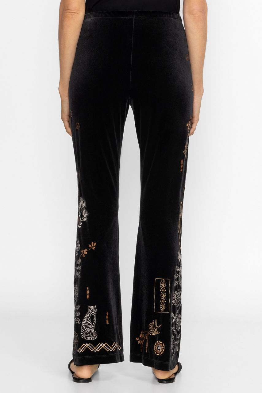 Embellished with intricate colorful placement embroidery, the Stretch Velvet Baby Boot Leggings are the perfect combination of decadent comfort and elevated style. Featuring an elastic waist, these stretch leggings are finished with a flared bootleg hemline. Pair with a bold tunic and jewelry for a fresh eclectic look.