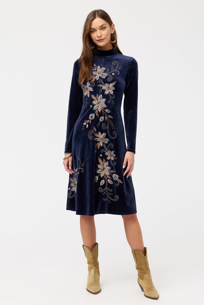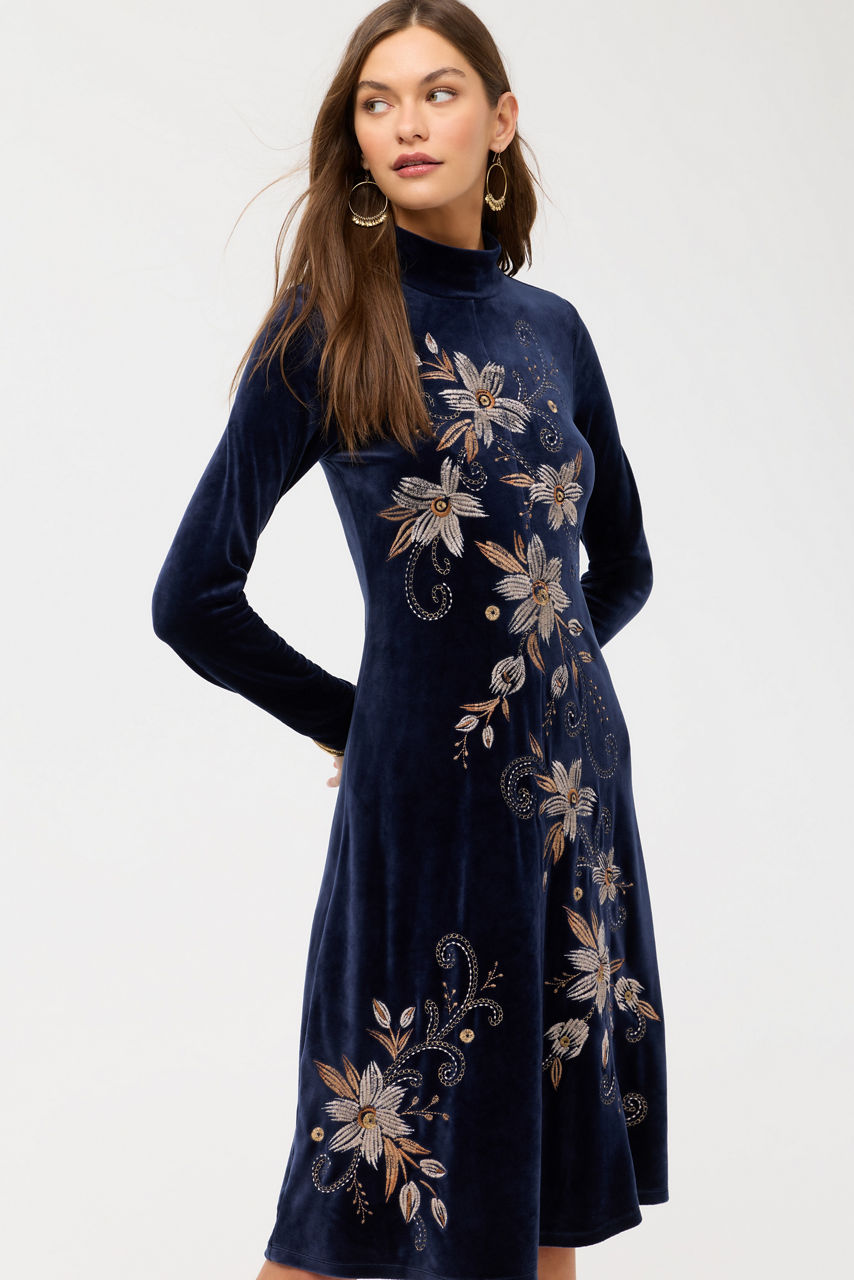 Brilliantly embroidered with an intricate and vibrant pattern, the Corinthe Velvet Mock Neck Dress is adorned with delicate florals. Featuring a mock turtleneck and long sleeves, this pullover dress is finished with an A-line silhouette. Pair with strappy heels and a coordinating clutch for an elegant evening out.