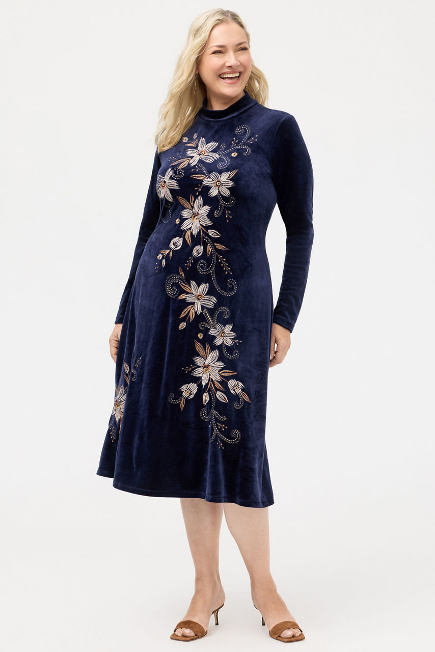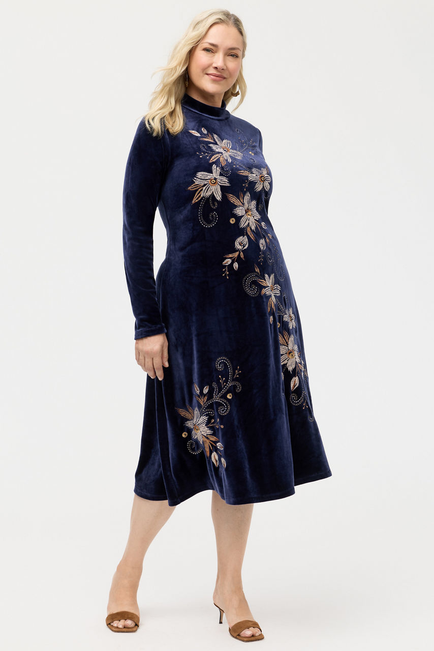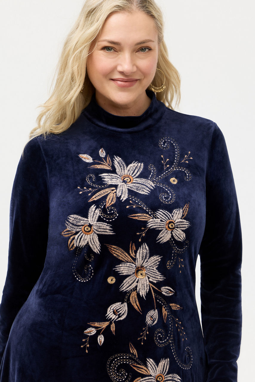 Brilliantly embroidered with an intricate and vibrant pattern, the Corinthe Velvet Mock Neck Dress is adorned with delicate florals. Featuring a mock turtleneck and long sleeves, this pullover dress is finished with an A-line silhouette. Pair with strappy heels and a coordinating clutch for an elegant evening out.
