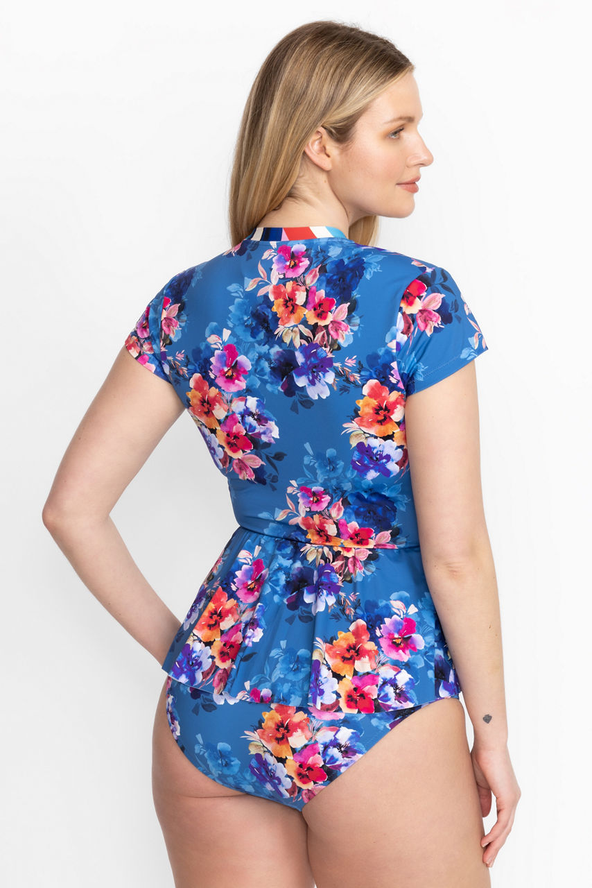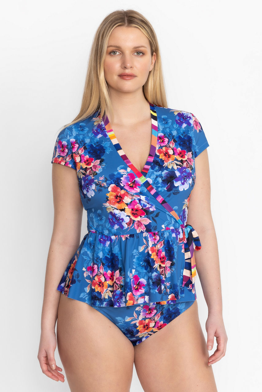 Crafted from a lightweight, quick-drying material, the Summer Days Mix Wrap Tankini Top offers elevated style embellished with brilliant floral bouquets. Featuring a wrap-front closure and cap sleeves, this unique swim top is finished with a fluttering peplum skirt for a distinctly feminine silhouette. Pair with the Summer Days Bikini bottoms and layer with white linen palazzo pants to go from poolside to brunch in style.