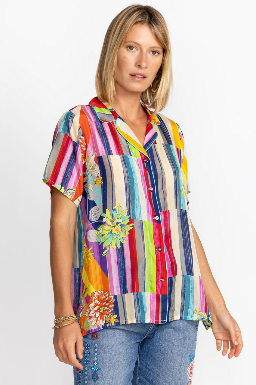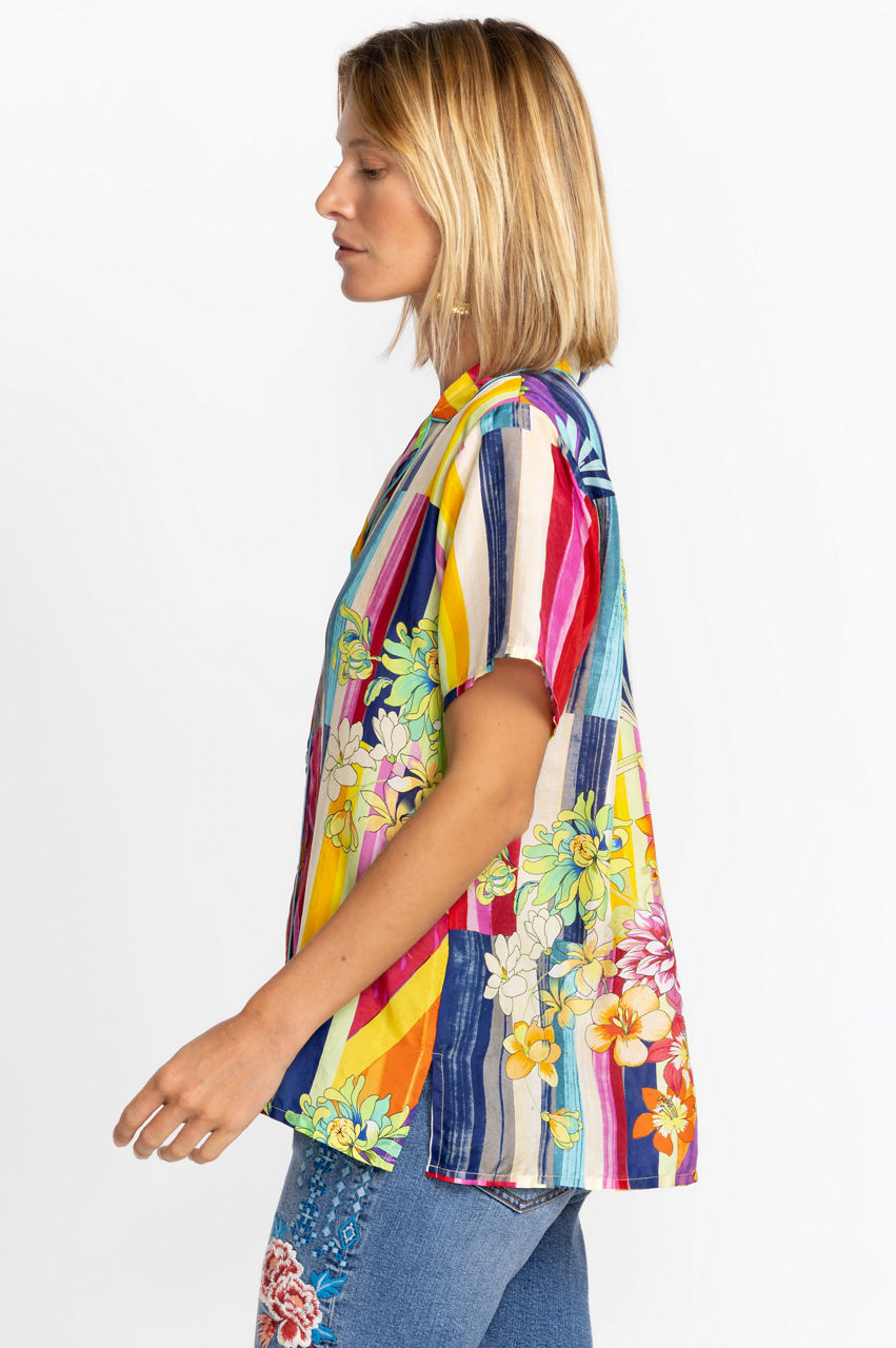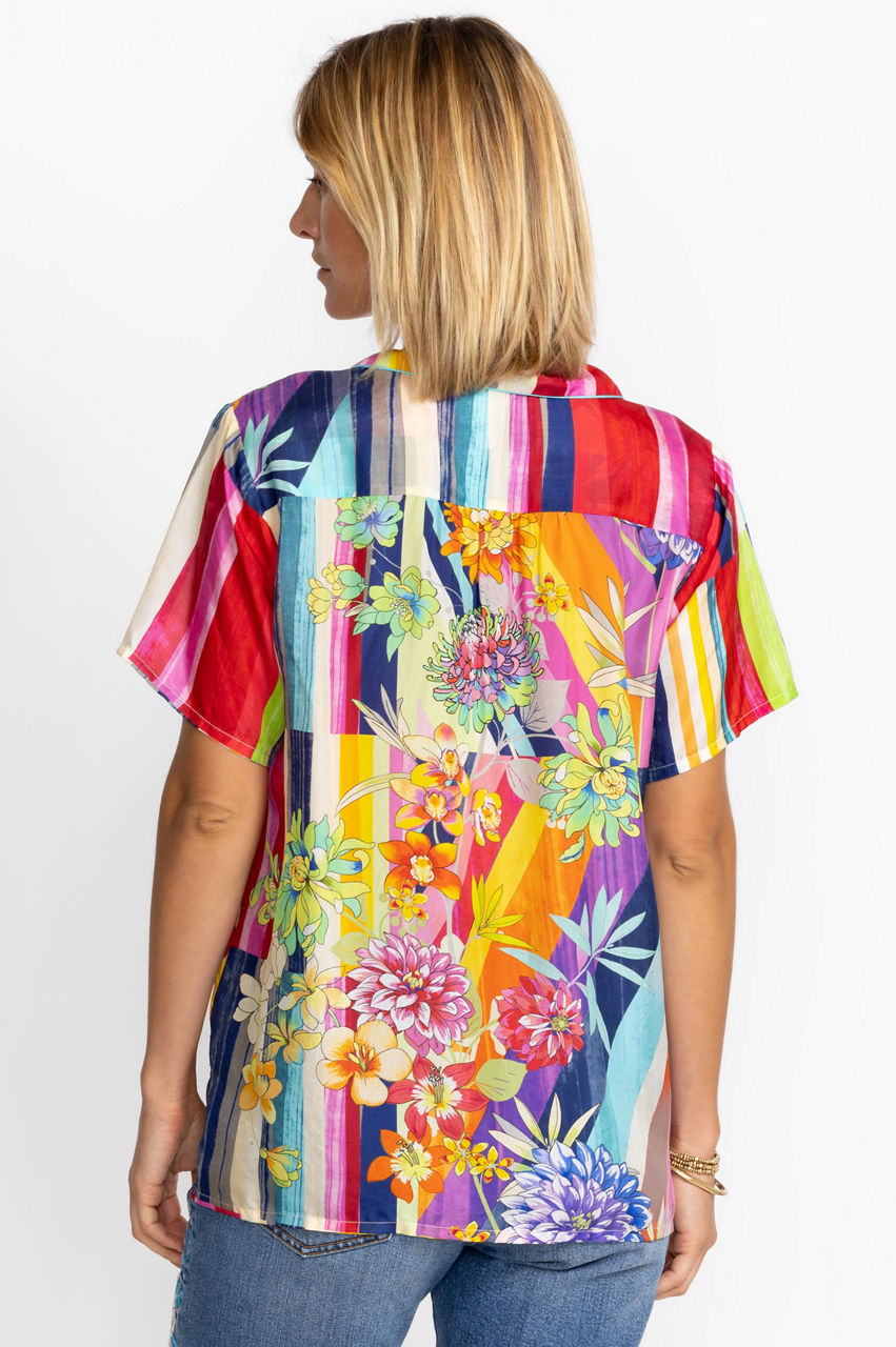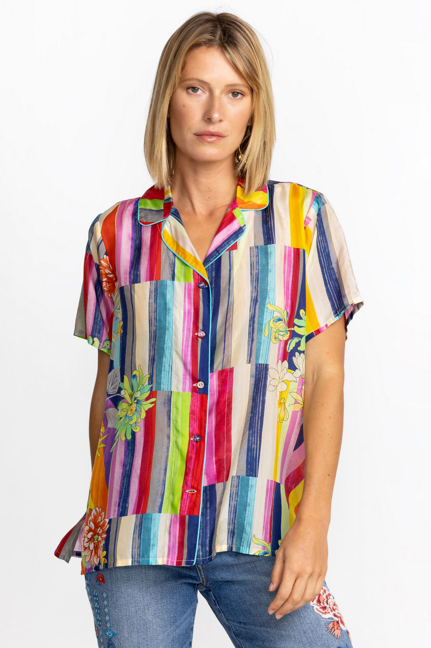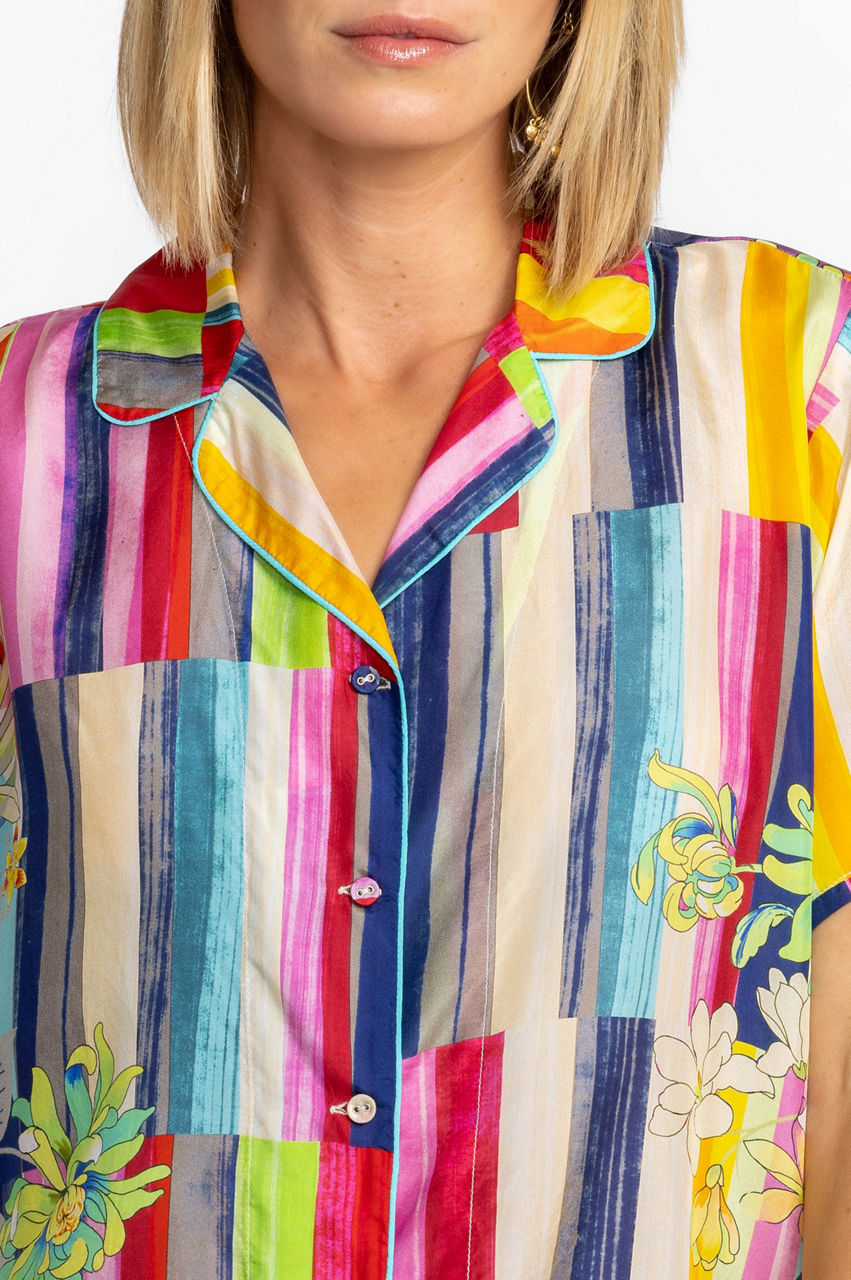 Crafted from 100% silk, the Summer Stripe Button Up is a refreshing take on a classic blouse. Featuring bold stripes paired seamlessly with soft floral hues, this lightweight, flowy top is an elegant statement piece. Pair with your favorite jeans or wide leg pants for a lively weekend look.