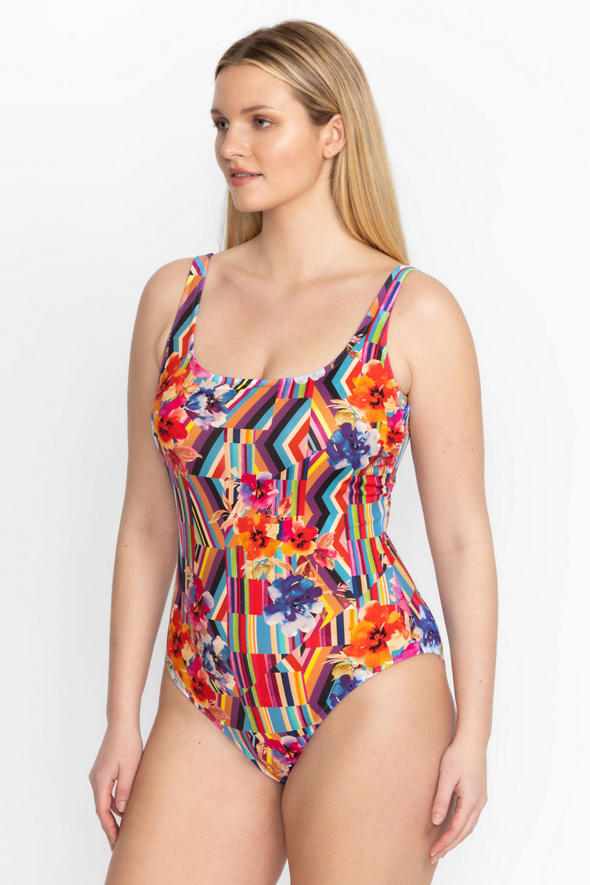 The Summer Stripes Tank suit One Piece offers a fresh take on a traditional swimwear silhouette. Featuring a scoop neckline at both the front and back finished with adjustable shoulder straps, this bold suit is embellished with vibrant color and eye-catching patterns. Pair with the Summer Stripe Sarong for a poolside brunch date.