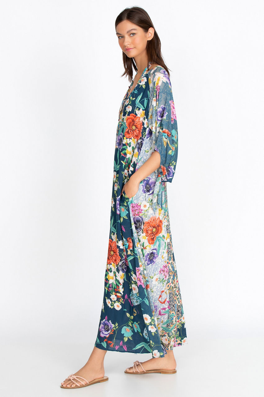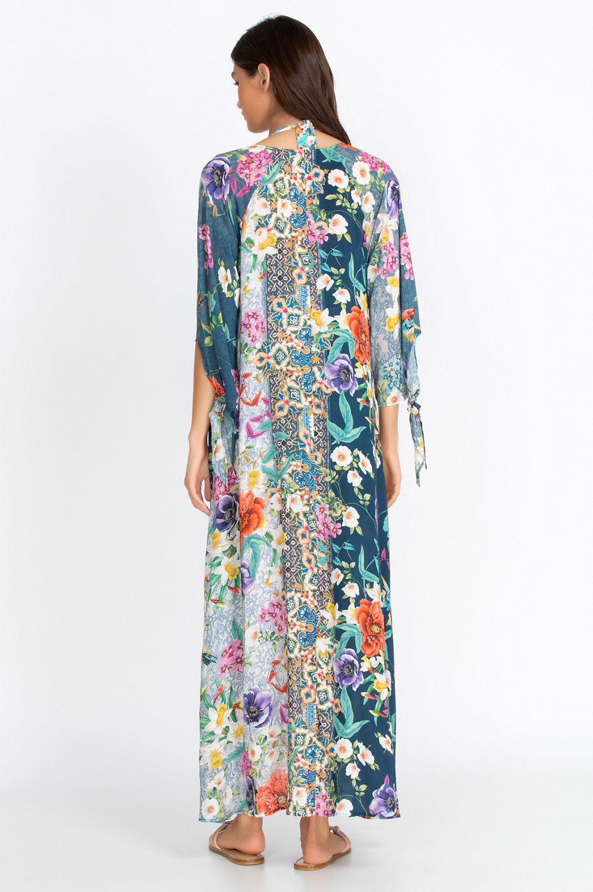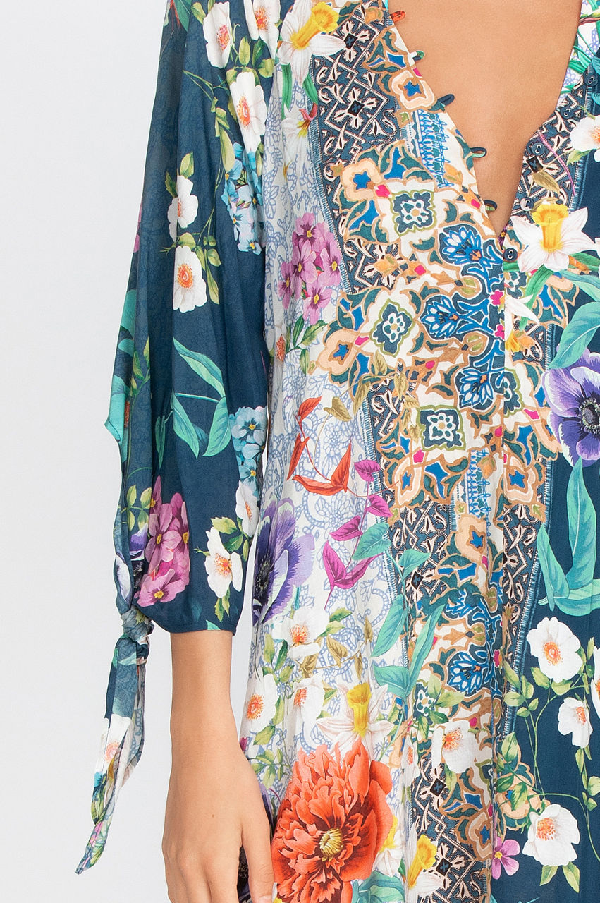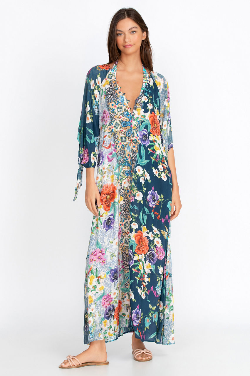 You can t go wrong with our Sunrise Long Dress for an day at the beach as a coverup. Easy to put on over a bathing suit our delicate button closures line the front, forming a soft V-neck, and feminine ties on the length sleeves flutter in the breeze.