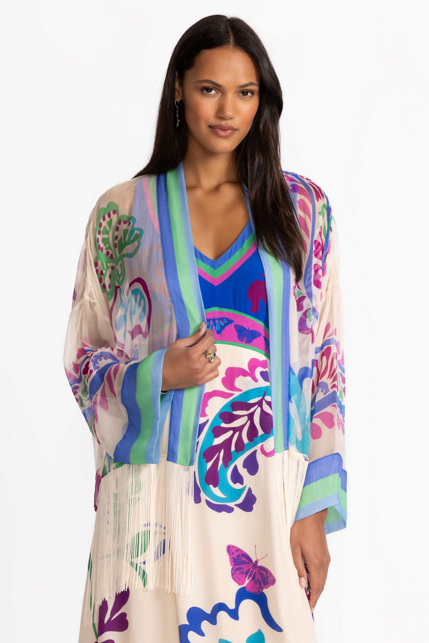 Crafted from 100% luxurious silk, the Sunset Fringe Kimono is adorned with an ornate pattern in rich saturated color. Designed with an open front bordered with bold contrasting stripes, this vibrant kimono is finished with an eye-catching fringe trim. Layer over a silk cami and pair with denim trousers for a casual ensemble perfect for a brunch date.