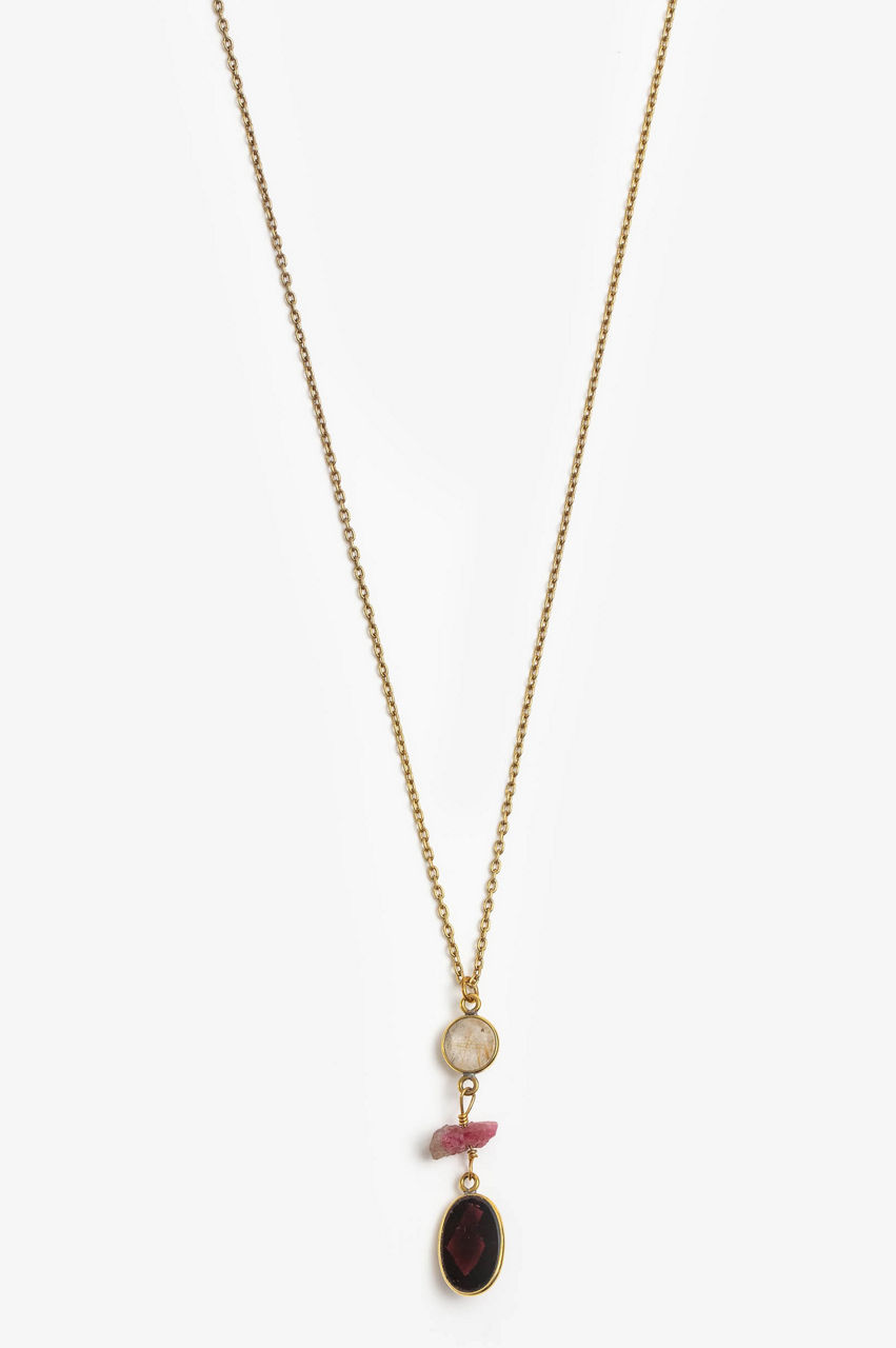 This stunning necklace uses a structured design that mixes different gemstones, including rutilated quartz, tourmaline, and garnet. The result is a unique mix of rich hues and interesting textures that create a gorgeous contrast with the metallic material of the chain. Let this necklace take center stage by pairing it with V-neck.