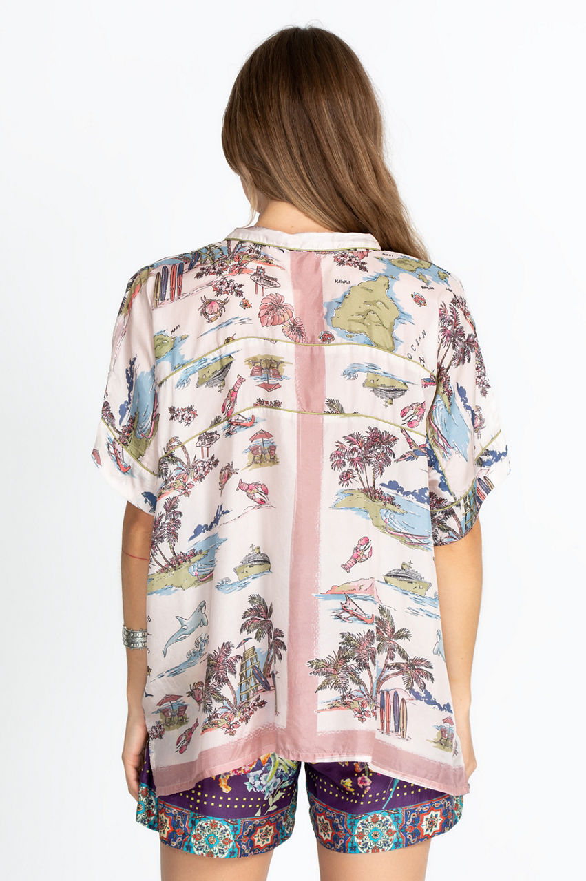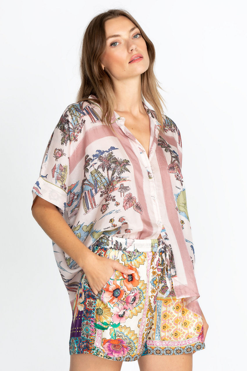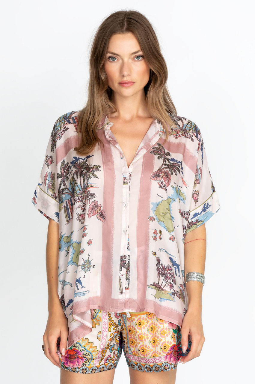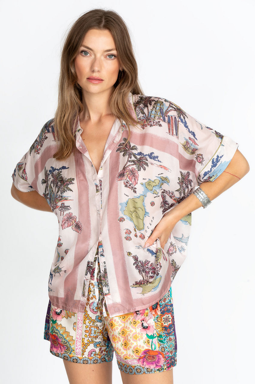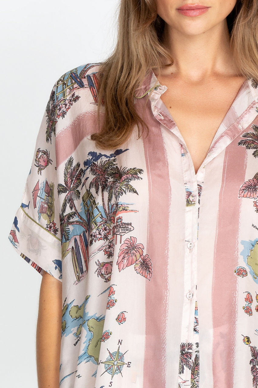 Ultra-soft with a playful palm tree motif, our Surfer Frankie Button Down features a fun take on the classic button-front style. With a bold print perfect for the summertime, this lightweight shirt is ideal for a summer day spent outdoors. Wear with jean shorts, sandals, and a trendy, floppy hat for an effortlessly