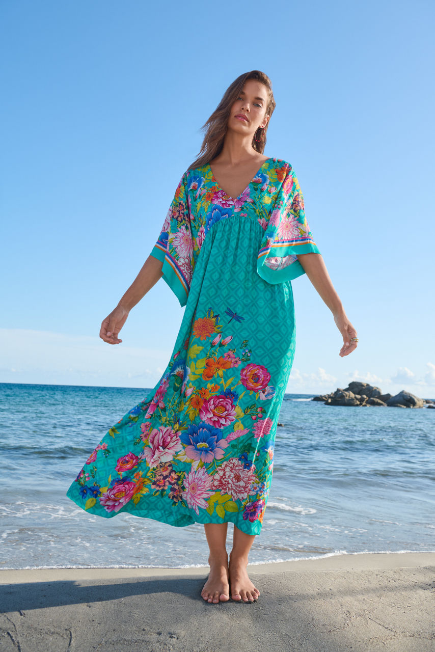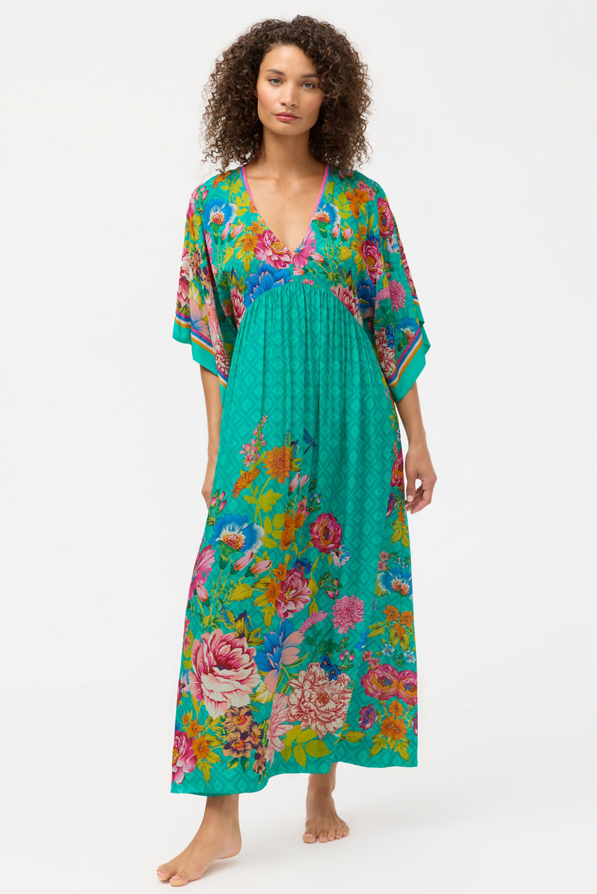 Featuring vibrant floral blooms the Sweetspire Kaftan Dress creates a classic flowing silhouette. Crafted from a lightweight, breezy material, this distinctly feminine dress features a V-neckline and Dolman sleeves complemented by a stunning empire waist and full-length skirt. Pair with Sweetspire swimwear and leather slides for a perfectly coordinated poolside look.