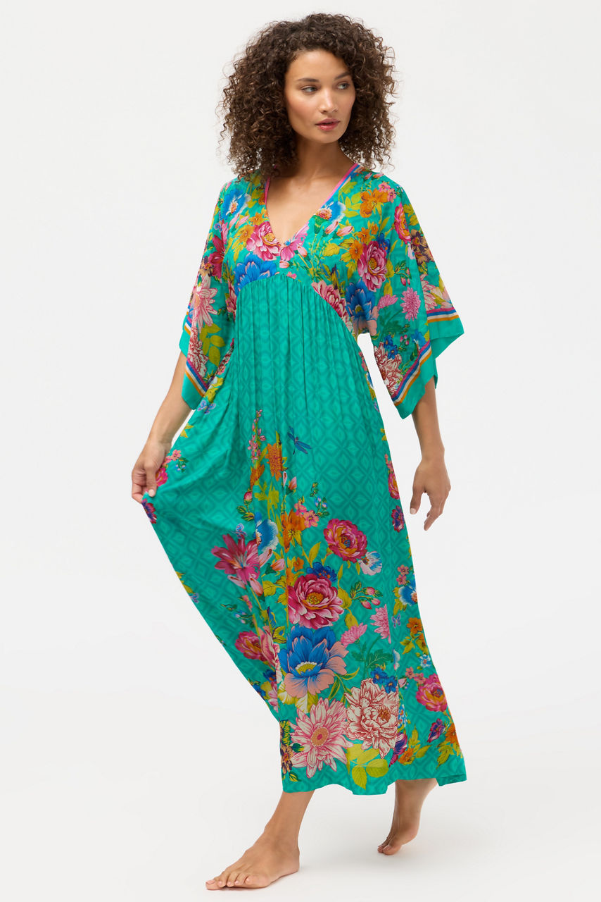 Featuring vibrant floral blooms the Sweetspire Kaftan Dress creates a classic flowing silhouette. Crafted from a lightweight, breezy material, this distinctly feminine dress features a V-neckline and Dolman sleeves complemented by a stunning empire waist and full-length skirt. Pair with Sweetspire swimwear and leather slides for a perfectly coordinated poolside look.
